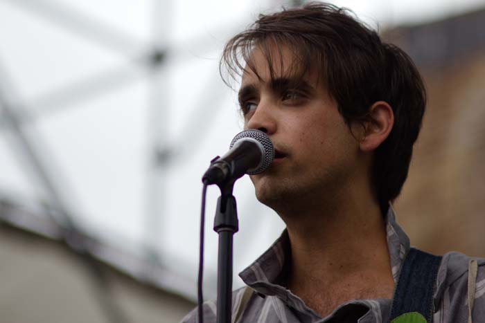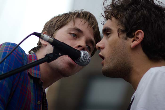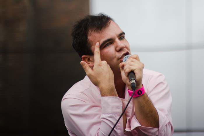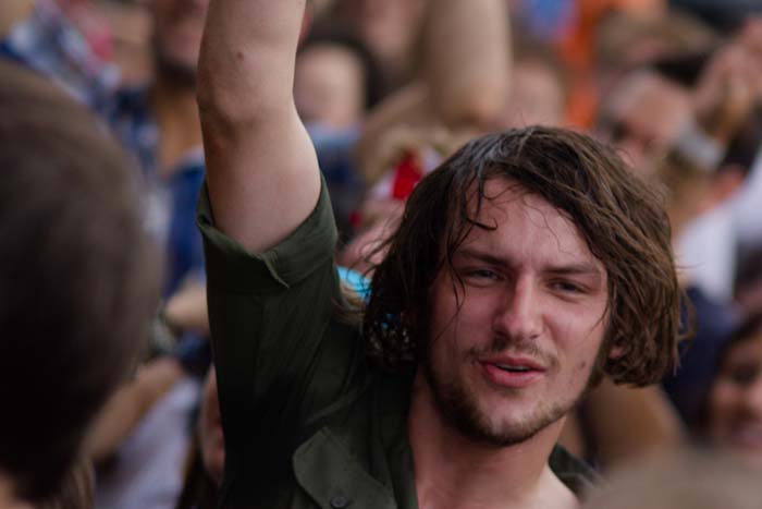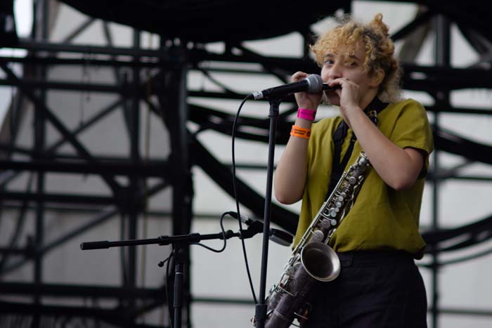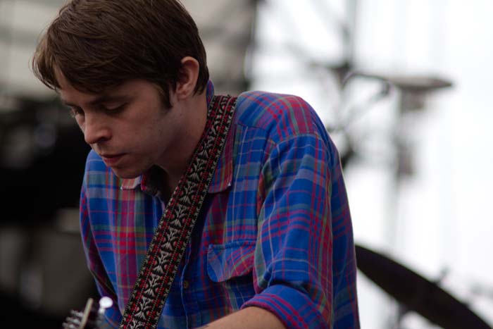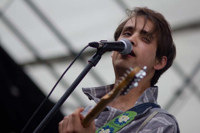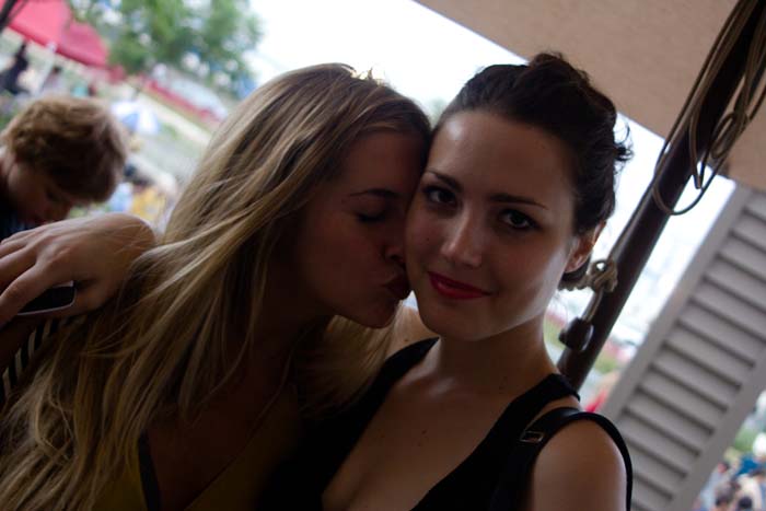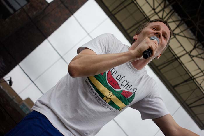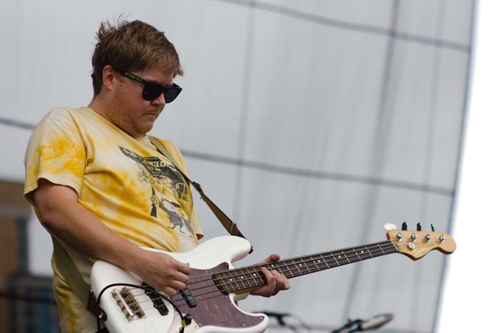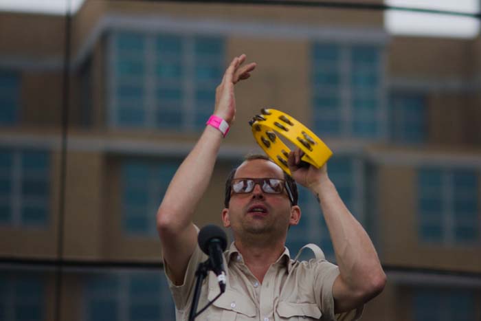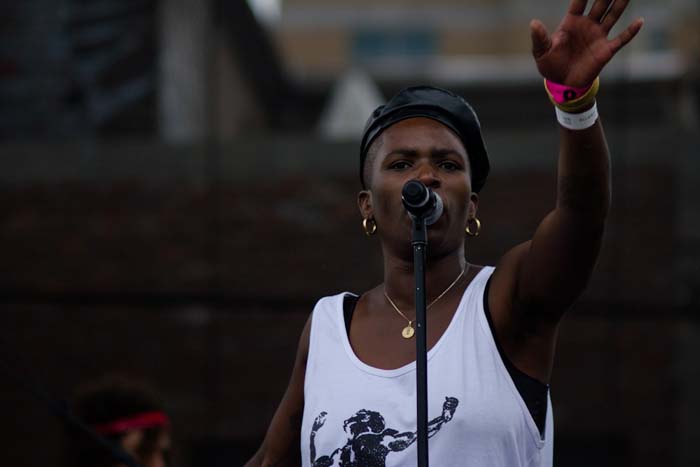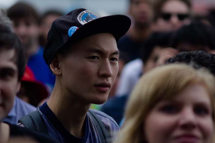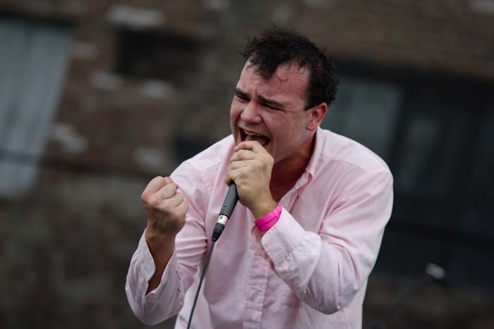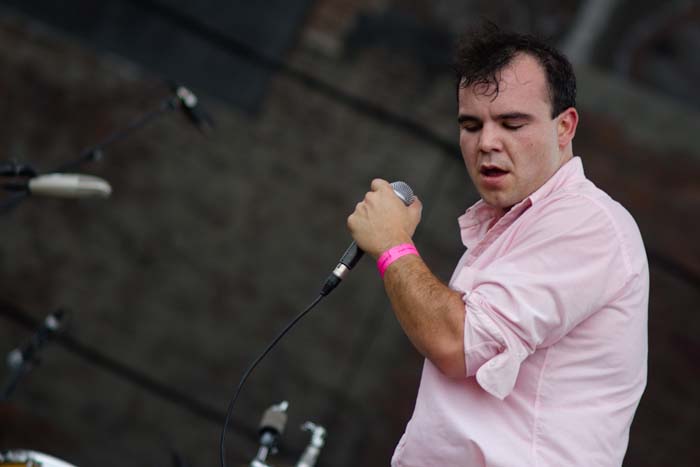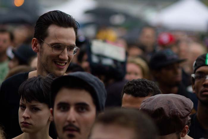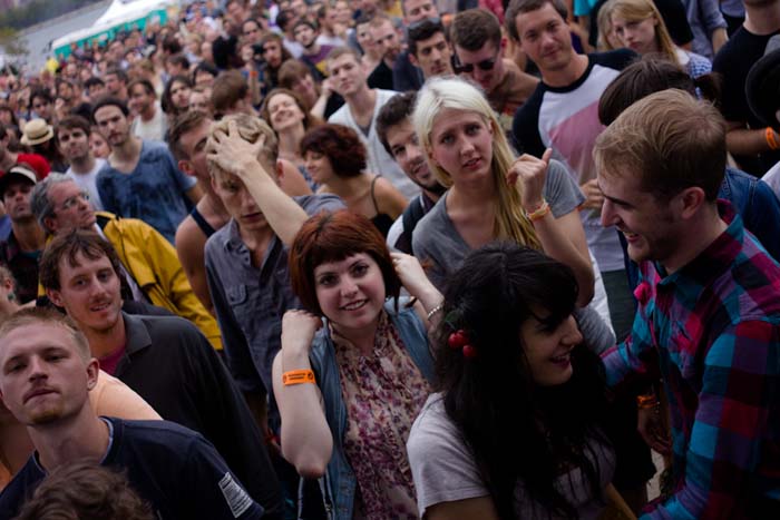 Strange weather, wasn't it for !!!'s free show down at the Williamsburg Waterfront on Sunday. Photographer Chris Person braved the ominous skies, intermittent rain, and the free rum lines at the VIP section at the adjacent All Saints Pub for this set of shots from the day.