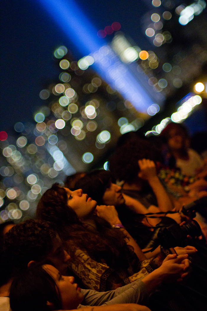 A set of photos from Panda Bear's #neverforget 9/11 show at Governors Island, where the views of Ground Zero and the light tower memorial were crisp and clear, and the sounds were dominated by the hazed dance of Teengirl Fantasy (one of 40 favorite new acts), Portugal's Gala Drop, and of course all that Noah performed, from Person Pitch and Tomboy, etc. Below there's a beautiful minute video of the set by Big Ass Lens, or you can download the entire set from nyctaper.