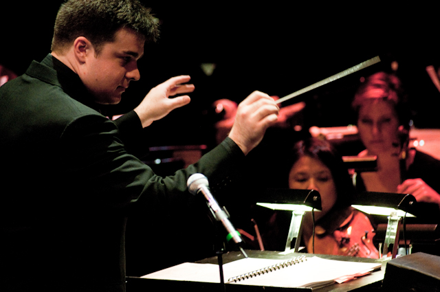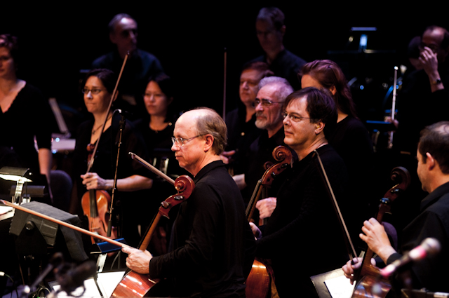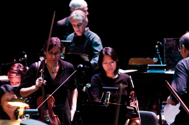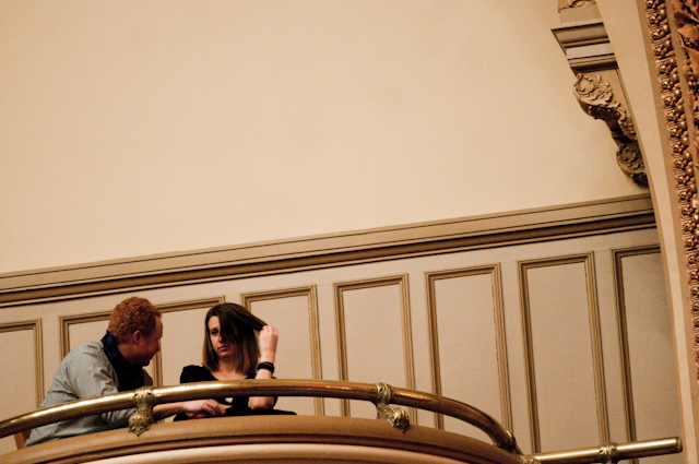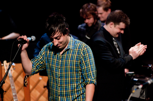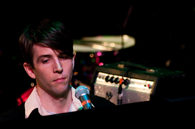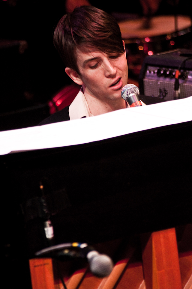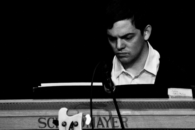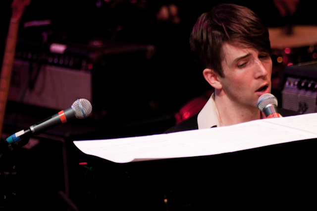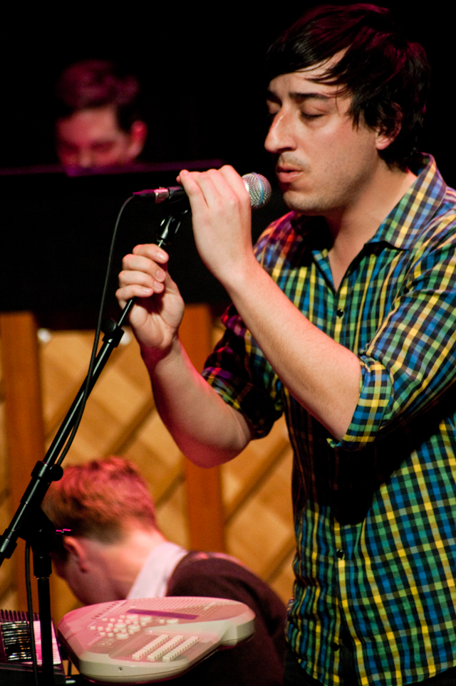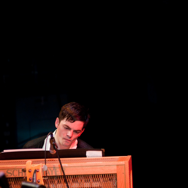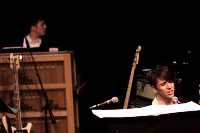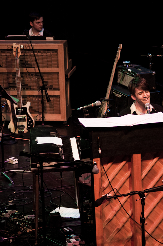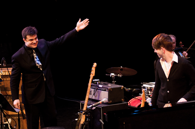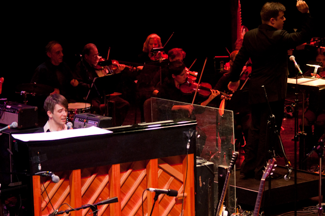 Last year the Times hailed Owen Pallett as the quintessential figure in the return of the one-man band, so there was a certain poetry in seeing Final Fantasy's works expanded by the Brooklyn Philharmonic's sweeping and nimble arrangements on Friday night. Owen sang and sat at piano all night, playing relatively little, not even a violin within reach, self-deprecating about his instrumental-castration while captivating over a nine-song set that hit the high points along his discography (from Has A Good Home to this year's EPs). Along with Nico Muhly on celeste and the National's Bryan Devendorf on drums, Owen invited Aaron Dessner to play electric bass on a pair of new tunes ("The End Of Time" and "Tryst With Mephistopheles"). When Dessner stood with his electric bass, Owen occasionally peeling strips of tape from his piano for percussive effect, the high-low nature of these BAM collaborations snapped into focus. Then, and also when the announcer introduced the series as a collaboration between the Philharmonic and "indie-rock ensembles," which made all the musicians in the crowd chortle.