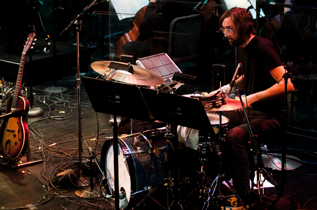 Grizzly Bear's set was custom tailored for this one evening with the Philharmonic, revisiting and reinterpreting yet-again a catalog of songs that's seen revisiting and reinterpretation a few times now, via remix CDs, EPs, and their tendency to transformmaterial on tour. (Some only to be played again if with an orchestra, said Ed.) Nico Muhly handled arrangements for the Grizzly Bear portion, although we're told they aren't necessarily indicative of what he contributed to the new LP.Still, there were songs without orchestral accompaniment ("Two Weeks," "Little Brother," "While You Wait For The Others," "Deep Blue Sea," "He Hit Me," and "Reprise" with the Dessner brothers on guitar and banjo -- they are everywhere); during that time BP conductor Michael Christie made himself busy smiling at Chris Bear's stick work. Game recognizes game.