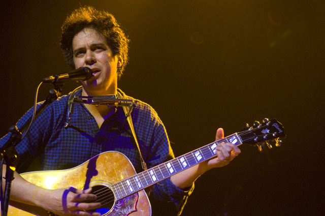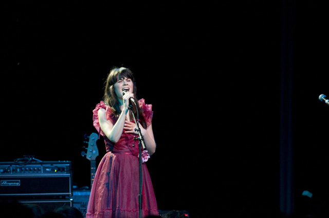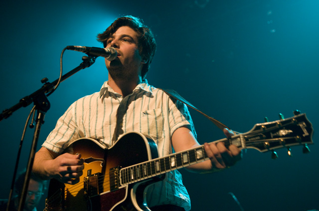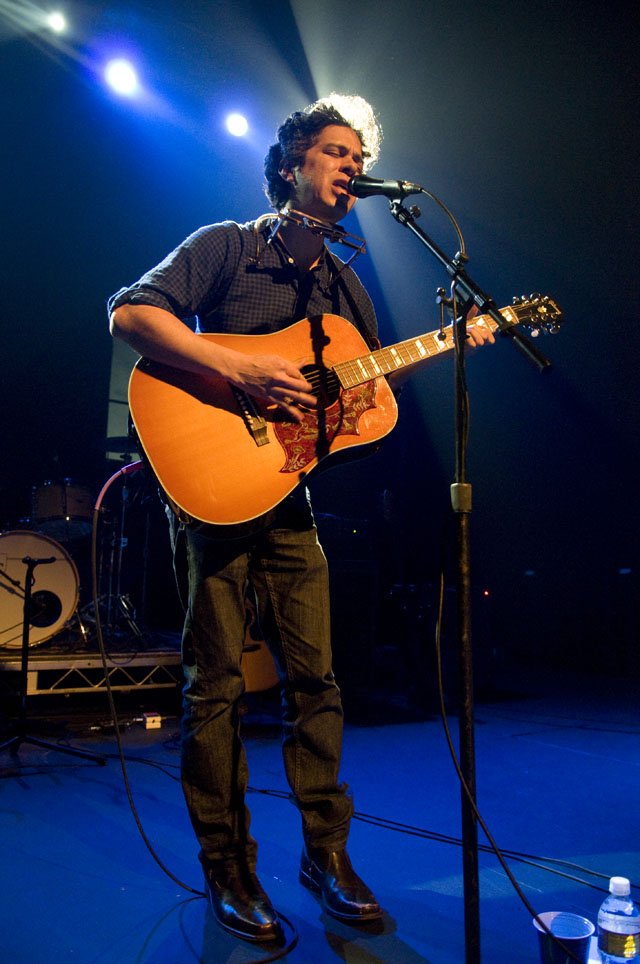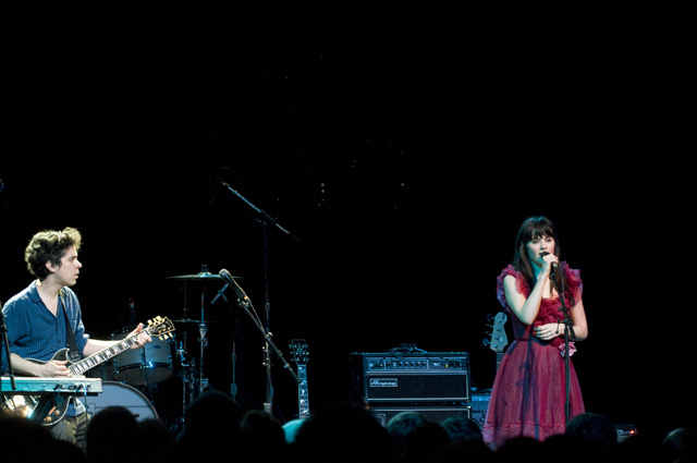 Although they never seem to be too far from each other, the She and the Him reunited last night for a few songs during M. Ward's very sold out show at Henry Fonda Theater. Matt ran the spread, from whisper quiet "Hold Time" to rollicking "Roll Over Beethoven," but naturally it was Zooey's (somewhat) surprise appearance that will most distinguish this one from other stops on the Ward tour. The pair joined on four songs mid-set ( "You Really Got A Hold On Me," "Change Is Hard," "Rave On," and "Never Had Nobody Like You") and again on the encore, all the while Zooey blinded everybody by the size of the rock that she got from her Death Cab cutie. You can see it glowing in one of these pics by man on the scene Andrew Youssef, alongside shots of openers Delta Spirit. In related news yesterday we were reminded that Zooey's still an actress. More stops on the Ward tour: