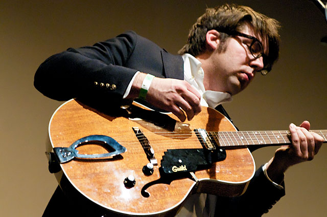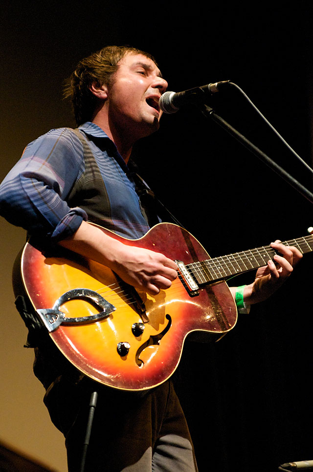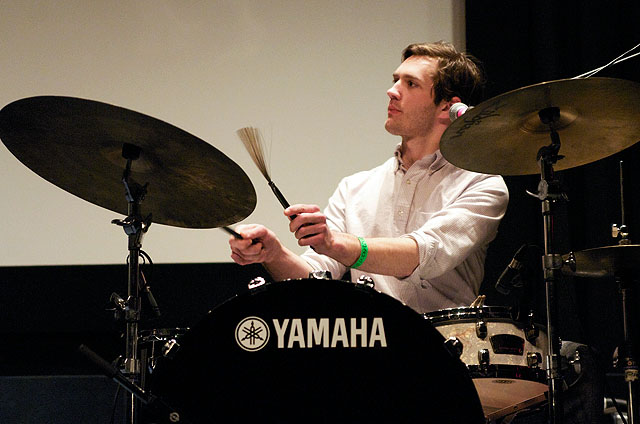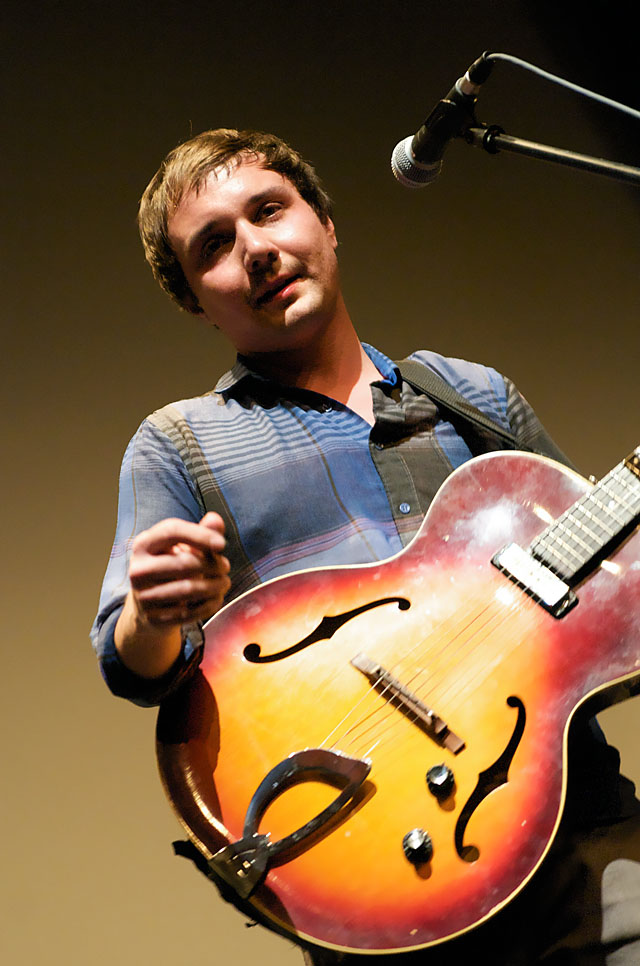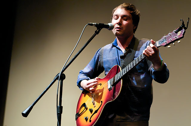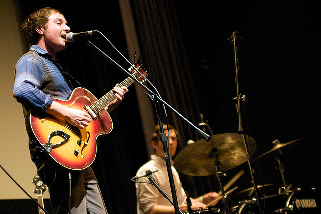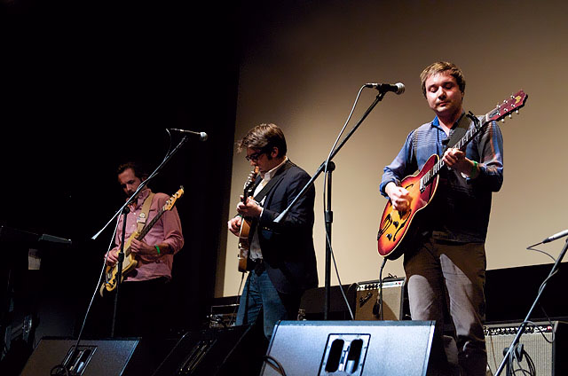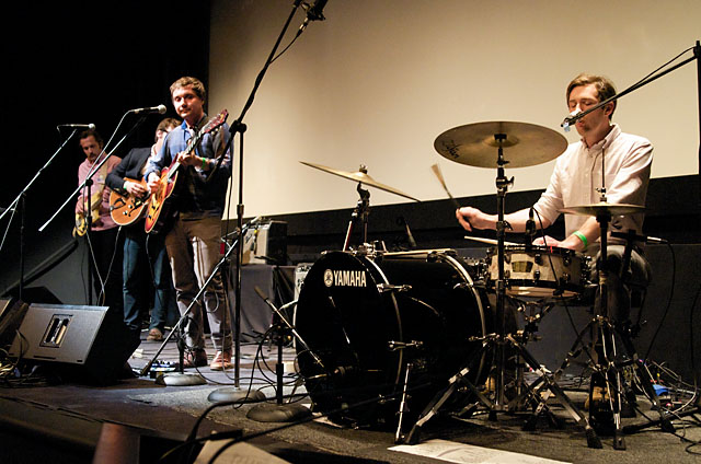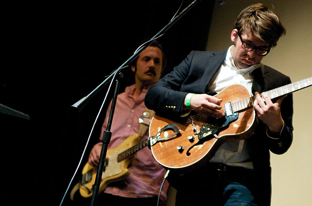 Last night at MoMA, Dan Rossen and Fred Nicolaus premiered their first video, for In Ear Park's woozy standout "No One Does It Like You." It was a PopRally event, the same performance series that has brought Sigur Rós and comedy short films to the museum in recent months. We sent Natasha Ryan to bring back images, and tapped the internet to bring back the video itself. They really went for it with the clip, depicting a battlefield populated with a battalion of short-skirted, masked, rifle-toting ballet dancers squaring off against a ghost-faced, marching troupe wielding bayonets and family portraits when in the infirmary. People die, ghosts arise, the dancing continues. Duh. After the crowd at MoMA sat through a Q&A with production team Directors Bureau, co-director/costume designer Marcel Dzama, and co-director Patrick Daughters, D.O.E. performed. If it all seems a bit ceremonious, that's probably because the video deserves a bit more than a simple publicist email with html code for posting. Now for that publicist-provided html code: