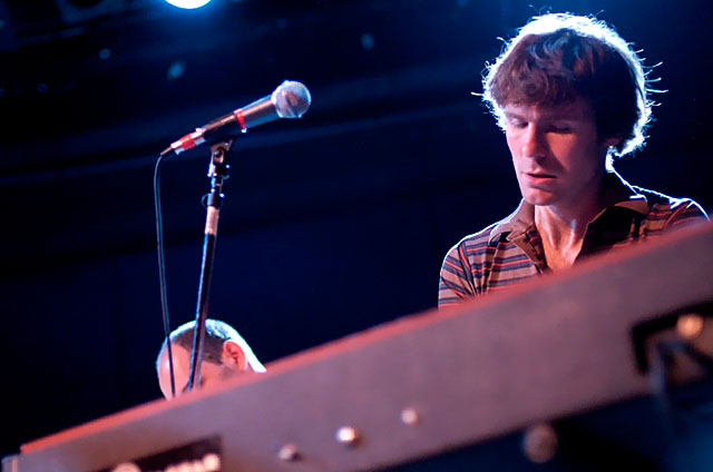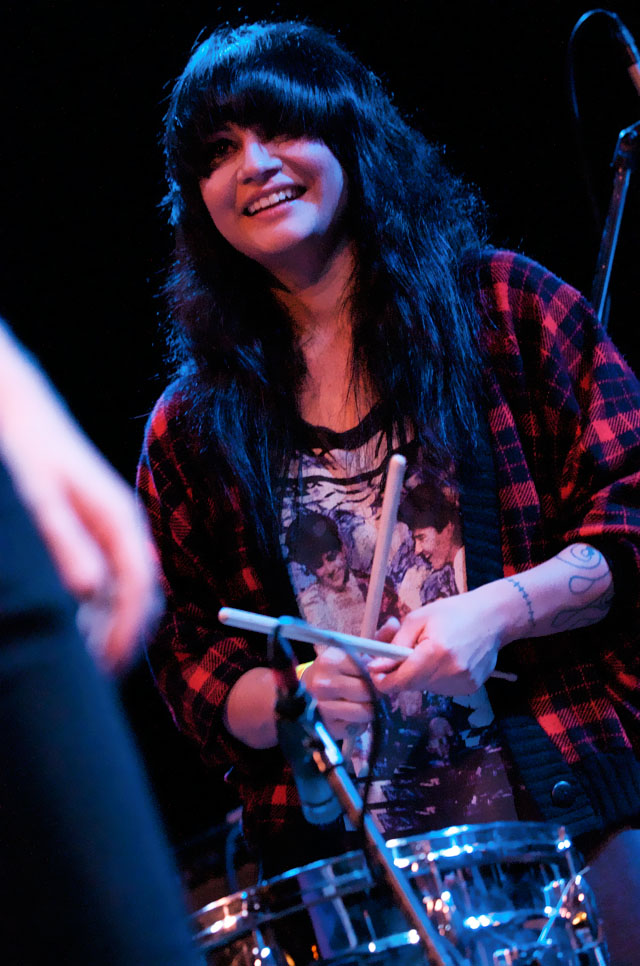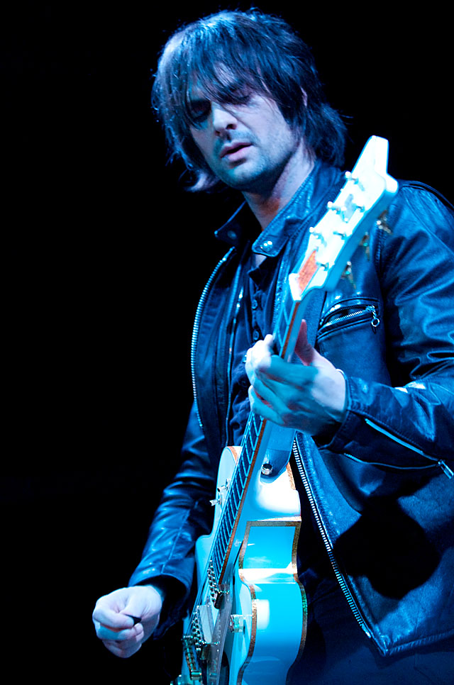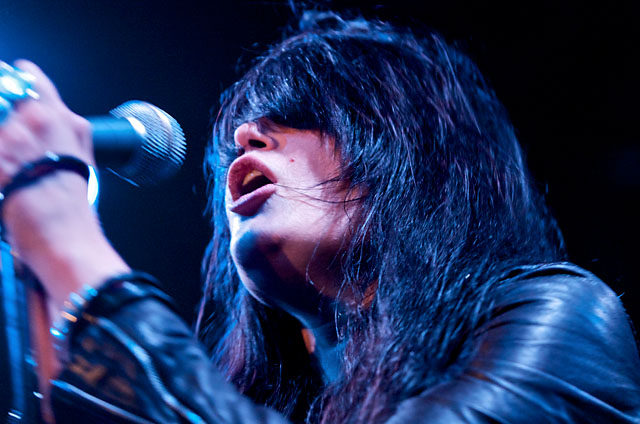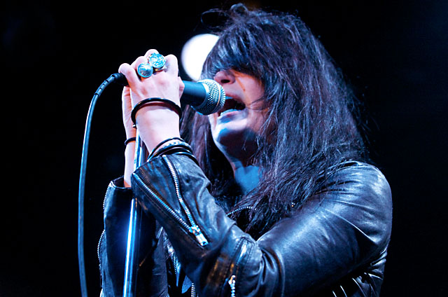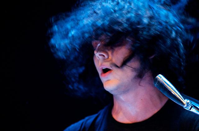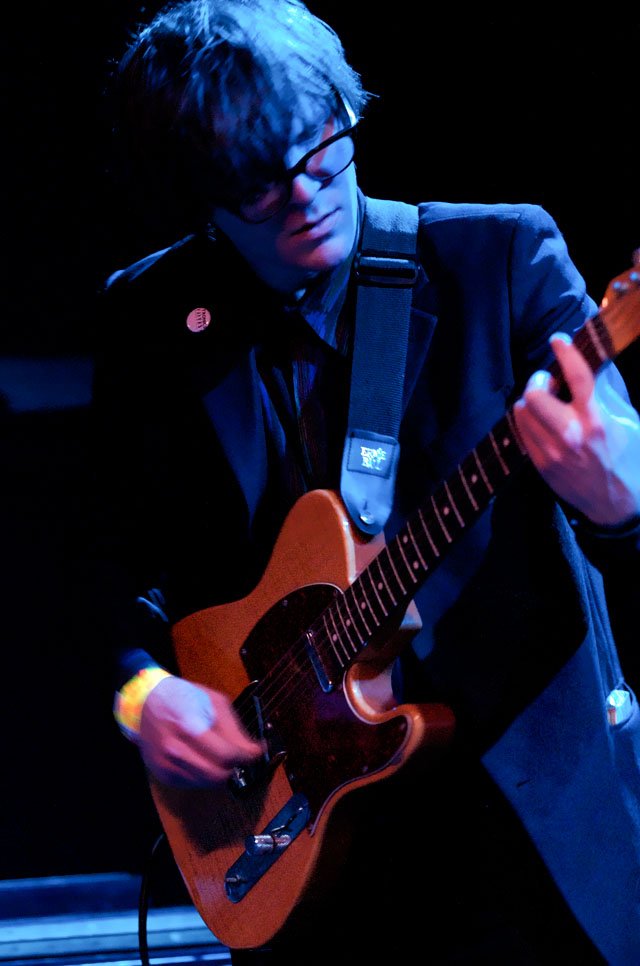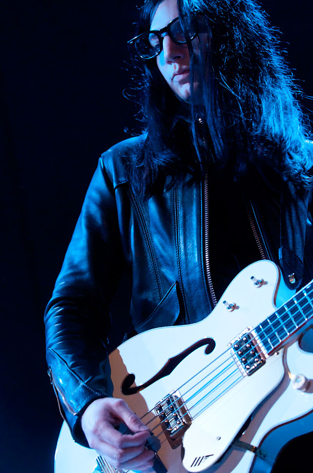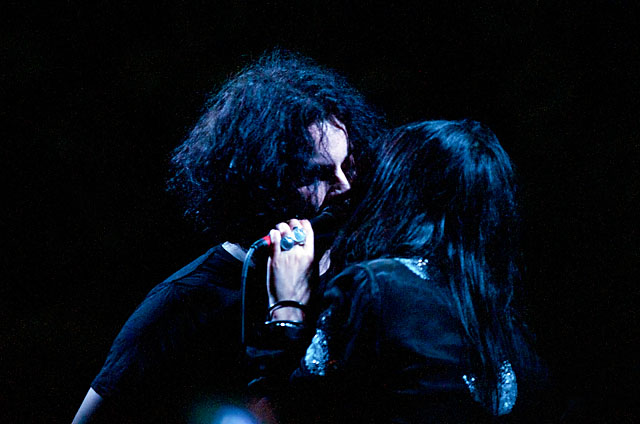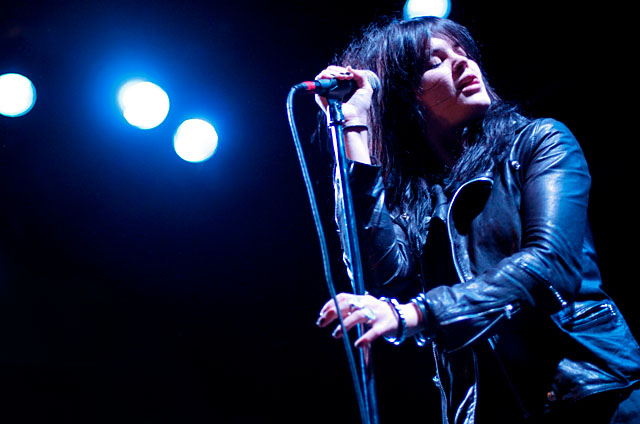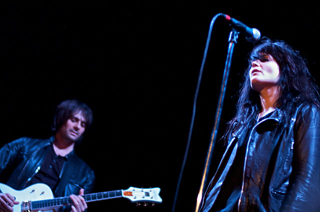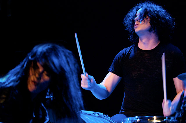 You couldn't be surprised when the Dead Weather's roadies came out in uniform dress code (suits and bowler hats) last night: This was a Jack White show after all. Although according to those who secured access to last night's NYC debut of supergroup the Dead Weather, the focus was primarily on the Kills vixen Alison Mossheart, and ultimately how closely she and Jack sang into their shared mic. According to Ms. Modern Age, "the dynamic of the Dead Weather is hinged upon Mosshart's role as the ferocious, fearless leader and the rest of the band acting as her dutiful, capable soldiers." Jack spent most of the night singing from behind his drum kit, although he was on guitar before the show's close. The new outfit, rounded out by Raconteur Jack Lawrence on bass and Queens Of The Stone Age's Dean Fertita's on guitar, played one hour and two encores in promotion of their forthcoming debut record. We sent photographer Natasha Ryan to bring back pics of them and openers Crystal Stilts, and others helped out with video: