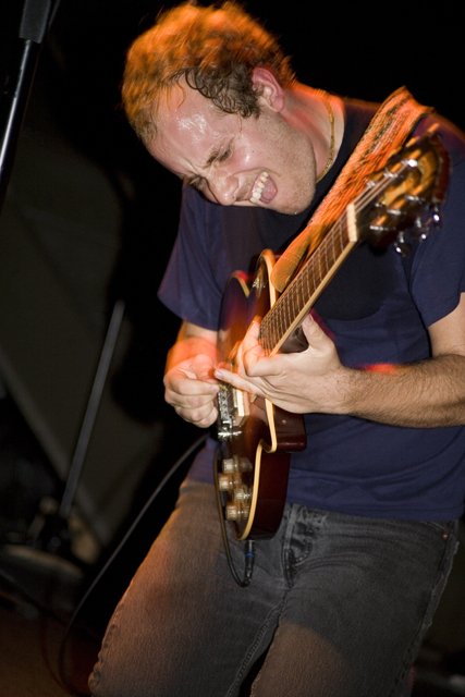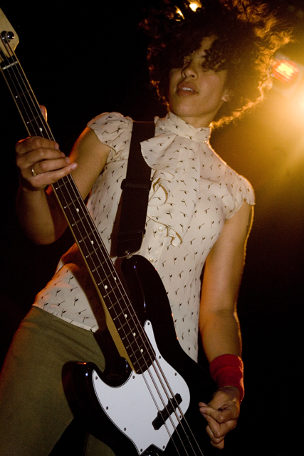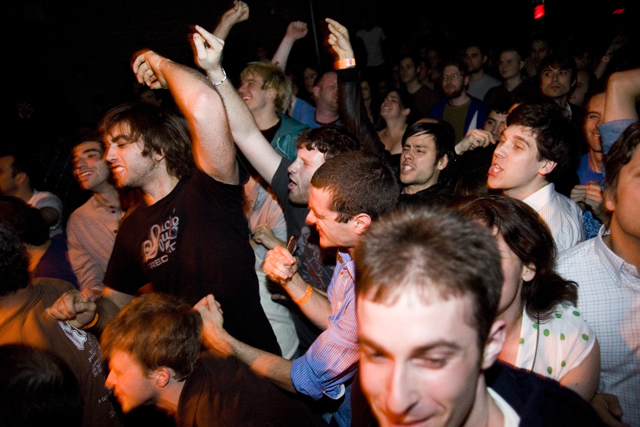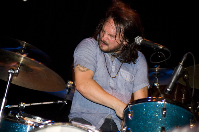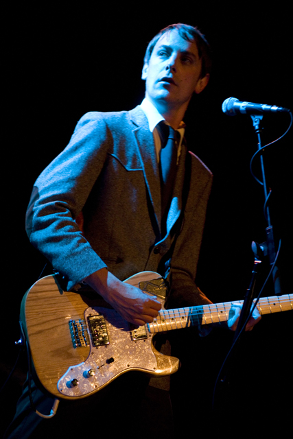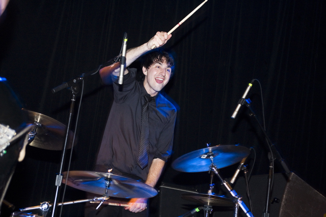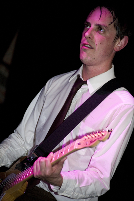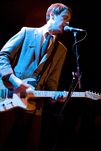 There are some great things about seeing a band like the Thermals. For one, you know you're gonna see at least twenty of your favorite The Thermals songs in one night. And even at a less-than-sold-out show that was a late-add to a pair of sold-out gigs Friday and Saturday, tired crowd and tired band, there wasn't a moment where Hutch and Kathy weren't full on. Maybe it was Hutch's "four martini breakfast." Or maybe it's just the effect of that good Kill Rock Stars money. (On his suit and tie: "I went to the stock exchange today, that's why I'm dressed up. We're so rich now. Richer.") It was a good setlist: Lots of Now We Can See and The Body, The Blood, The Machine, some More Parts Per Million, only "How We Know" from Fuckin' A (needs more Fuckin' A), and covers of Nirvana's "Sappy" and the Breeders' "Saints." Apparently this run was was all about the raucous Saturday show at Bowery, but even on a lower key night, the Thermals represented in the same way they register their Big Idea punk-pop: disarming with superficially sloppy charm but delivering taut, smart tunes with methodically misleading ease. Photographer Santiago Felipe was on hand to flesh out this gallery, and here's last night's setlist and the upcoming tour dates: