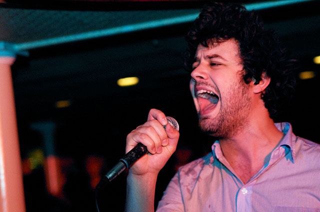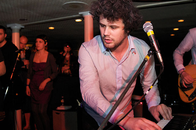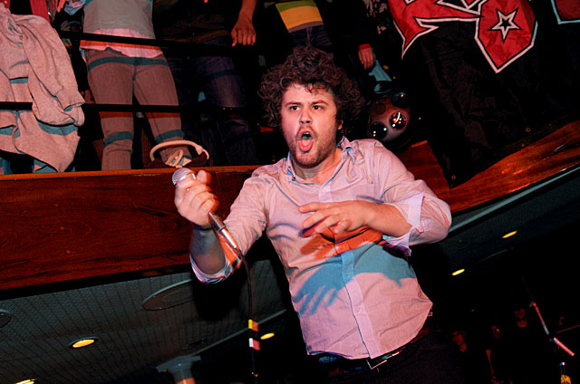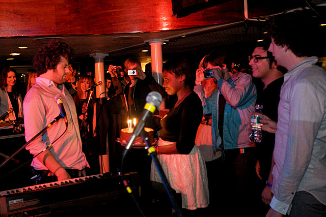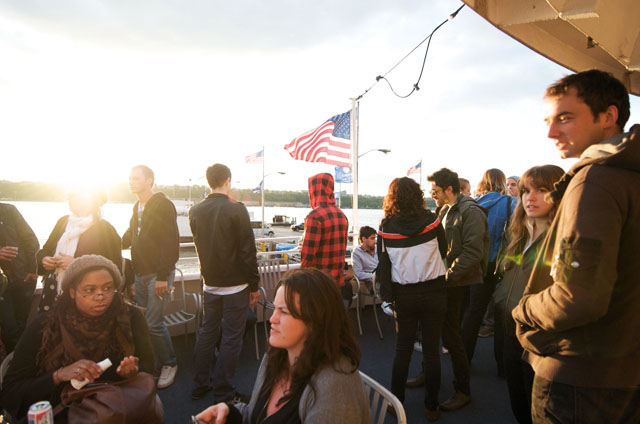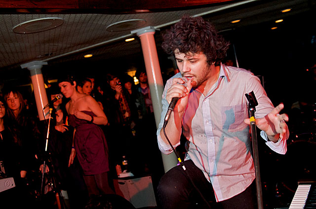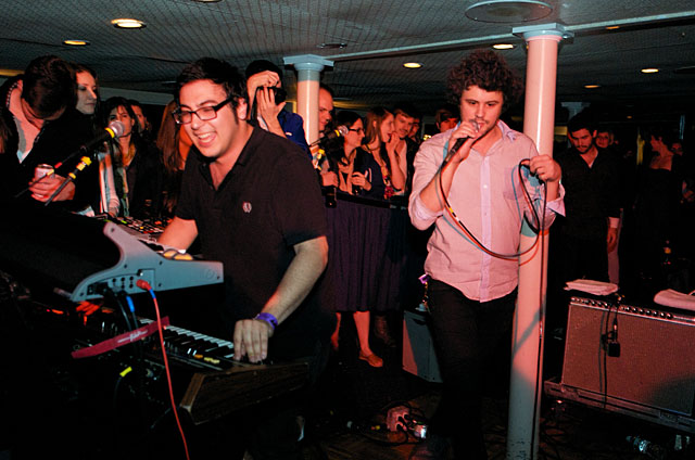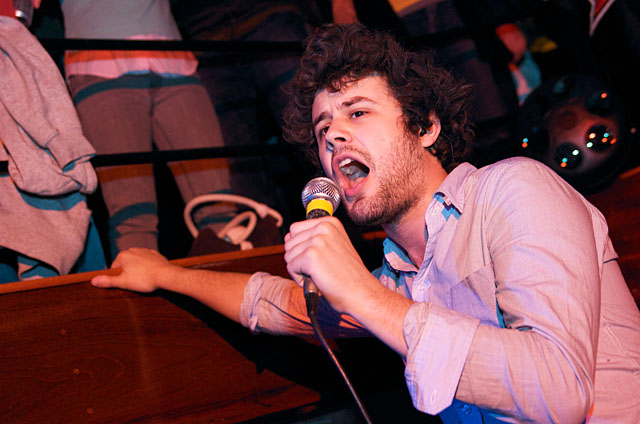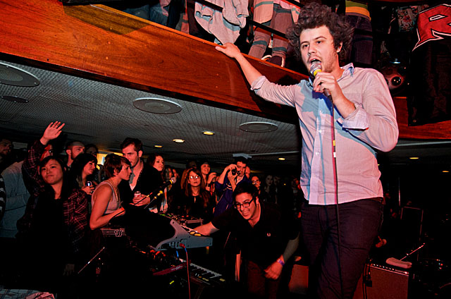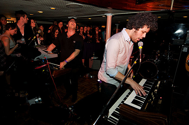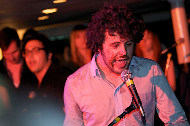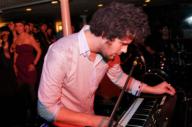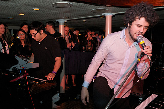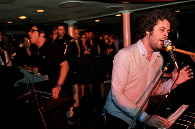 Last night Passion Pit celebrated their debut LP release by cruising New York Harbor on the Rocks Off boat cruise. Rest assured the event was thoroughly Tweeted. Fans boarded the Temptress yacht at 8PM for the three hour tour during which Cambridge's buzzy synth-pop revivalists entertained with Manners. According to our photographer Natasha Ryan, folks were dancing like crazy, which was probably not easy in this venue, but it wouldn't have been much of a party otherwise. Yesterday was also frontman's Michael Angelakos' 22nd birthday, so that's explains the cake all over his face towards the end of the photo set. No word if he managed to fuck a mermaid.