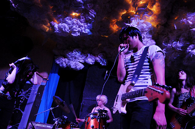 Some more photos from the show that brought newly tagged Band To Watch Beige onto our listening docket here, by way of photographer Natasha Ryan, who captured headliner Alex Zhang Hungtai aka Dirty Beaches both onstage and in outdoor portrait last Friday. The night before, Hungtai performed a set at Mercury Lounge in his typical setup, solo and set to backing tracks from his recommended LP Badlands. The songs look to greaser rockabilly and David Lynch soundtracks, evoking punk ala Lux Interior and Alan Vega; onstage Alex plays his Elvis after a stop at the tattoo parlor part well, slung with guitar, brooding like Brando or going live wire with his vocals like Lee Lewis. On this night he'd be joined for the first time with a backing band in the form of Philadelphia's Lantern, which he said Vice Mag had called "the best band in Philadelphia" (he upgraded it to "the world"). It was a proper pairing, in that all involved were interested in throbbing garage rock and jumping into the crowd. They played music they collaborated to write the day before. If it was messy, it was true to the spirit of their chemistry, which felt infectious, slapdash, sweaty, and a little dangerous. Still, the night was made when Dirty Beaches heeded crowd calls for his solo takes on "Sweet 17" and other album tracks. Being a loner suits him.