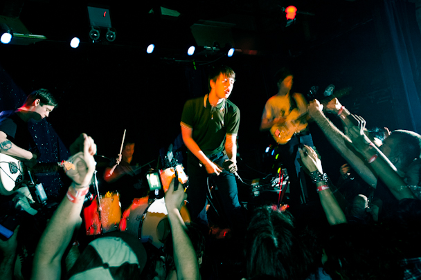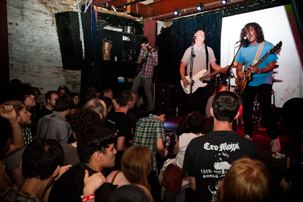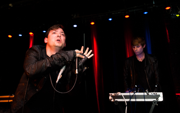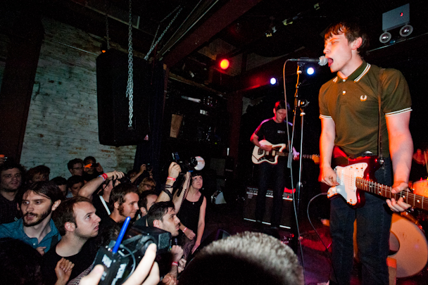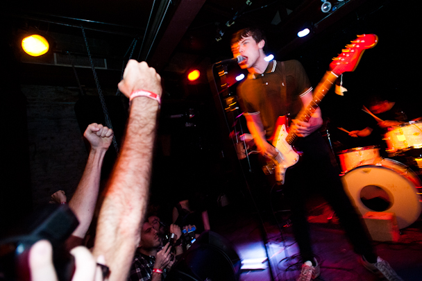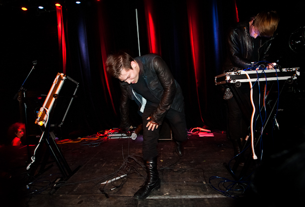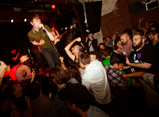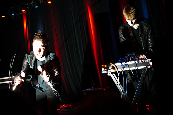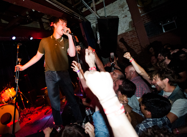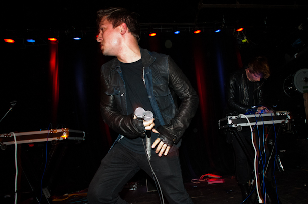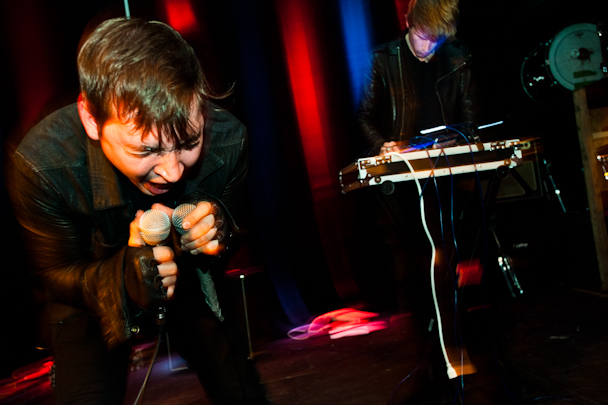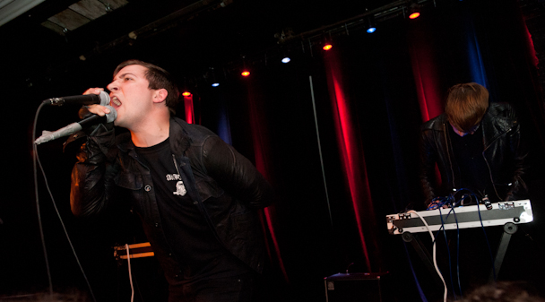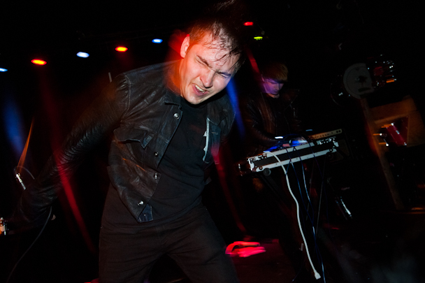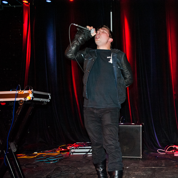 It's been bubbling awhile, but the anticipation for Iceage's sold-out American live debut boiled-over in the weeks leading up to the Stereogum/Sacred Bones Northside Showcase at Public Assembly. The underground excitement for co-headliner Prurient is always there -- especially considering Friday's set was his first in 2 years -- but excitement was also ratcheted up recently with the announcement of a new album Bermuda Drain and a new direction. Both delivered: If you left disappointed at 2AM, it's because you couldn't get into the venue. The Danish teens offered exactly what they needed to via a an expertly sloppy/angry/cynical/nervous/cocky/unhinged/buttoned-down 20-minute set crammed with New Brigade highlights and an appropriately punk, anti-climactic into-the-crowd exit. (As I said before SXSW, Iceage are my Odd Future.) The more experienced Dominick Fernow, joined by Cold Cave bandmate Wes Eisold, followed Iceage with exceedingly precise power-electronic catharsis -- it was violent, crisp, spastic, and, as mentioned, romantic. Sure, he wears a nice leather jacket now instead of ripping off his shirt like the old days and the Bermuda Drain material can be full-on danceable, but you won't find a more compelling or uncompromising noisemaker -- anywhere. I could go on about both sets for pages, but Ryan Muir's photos are more interesting: In addition to Iceage and Prurient, he snapped pictures of BTW Cult Of Youth and The Men, whose Leave Home is a surprise favorite of 2011. We also have video clips of Iceage (note audience response to "New Brigade," "You're Blessed," etc.) and Prurient's "A Meal Can Be Made" shot by Todd Pendu of Pendu NYC.