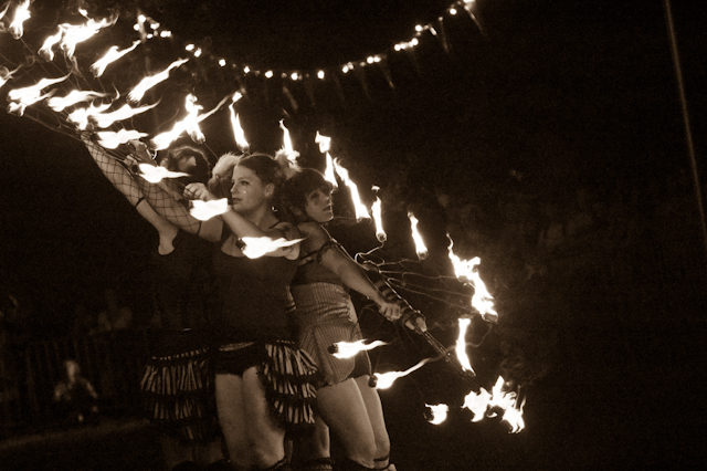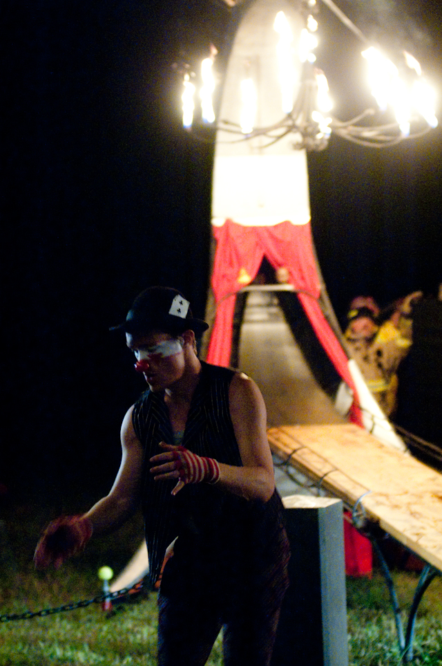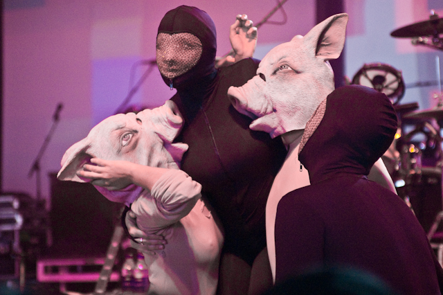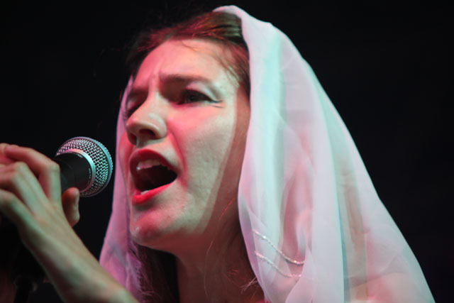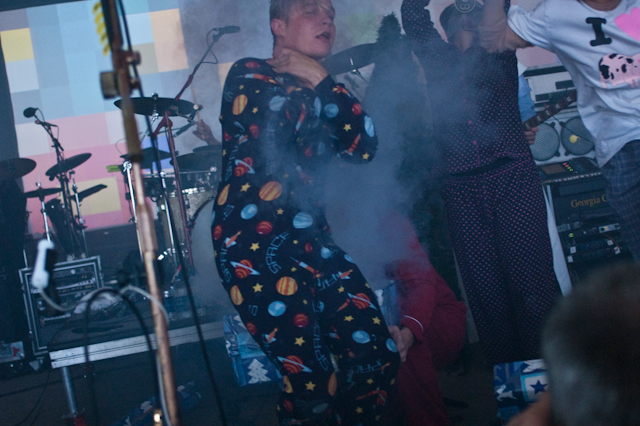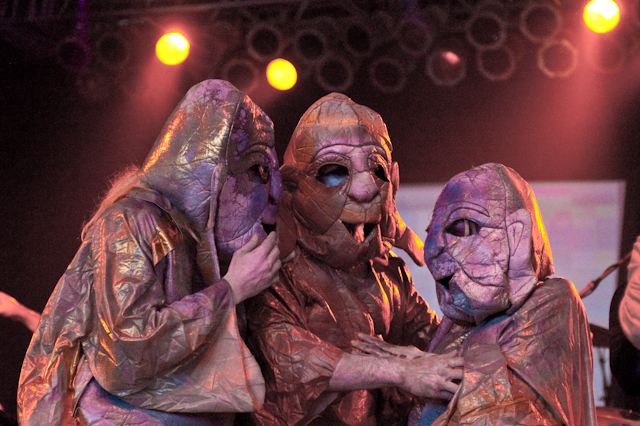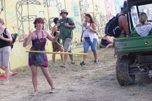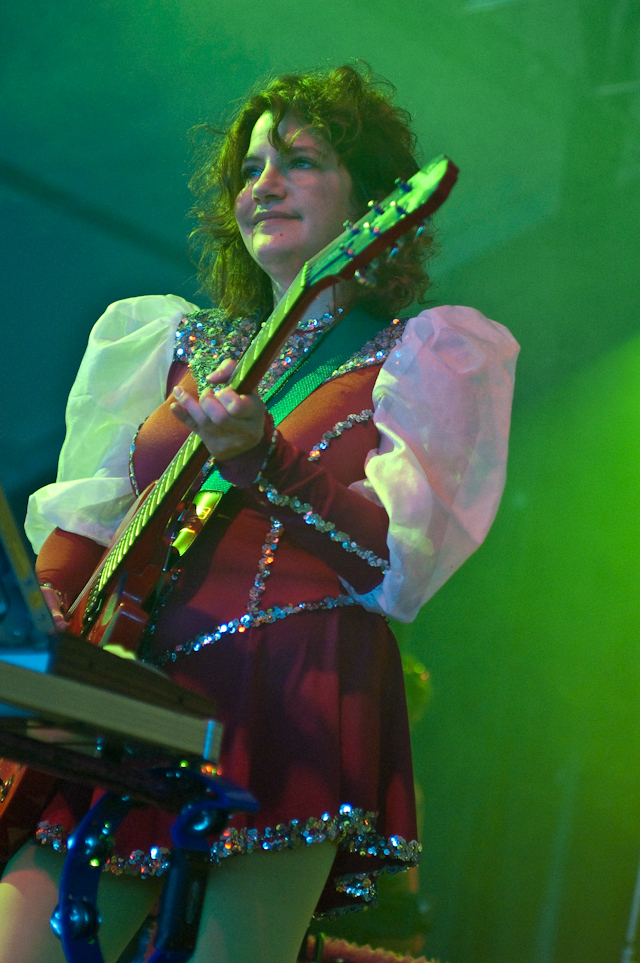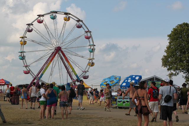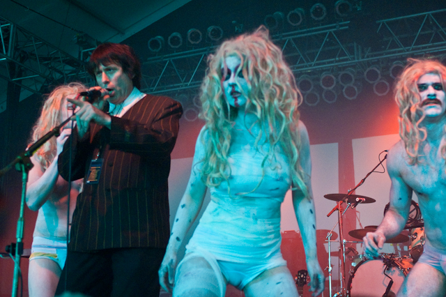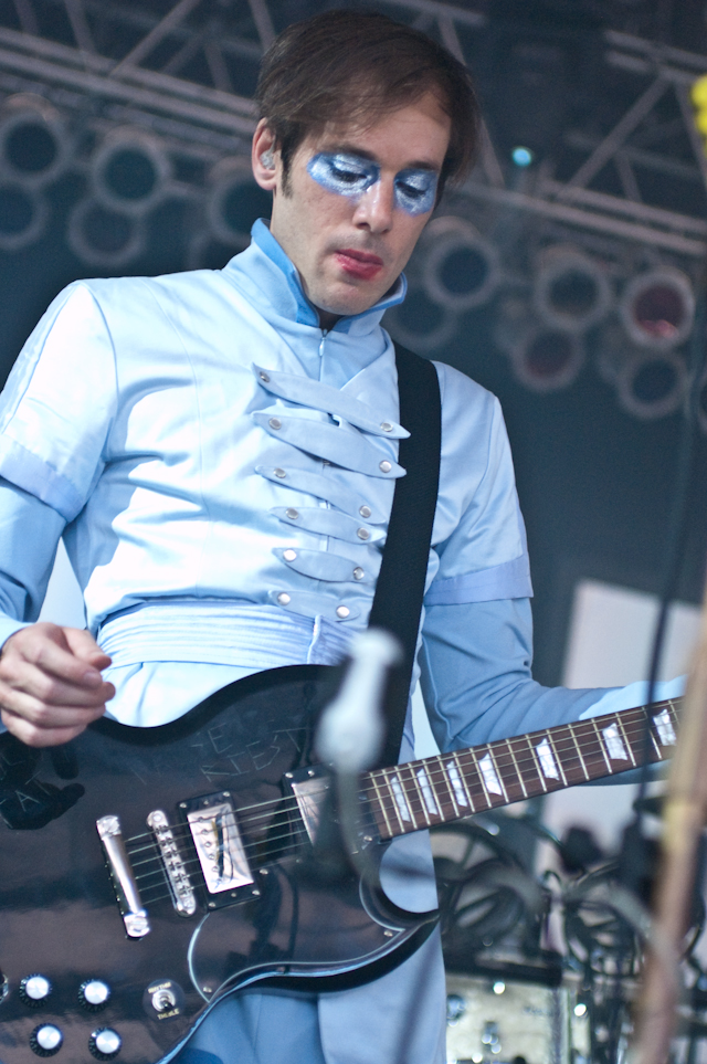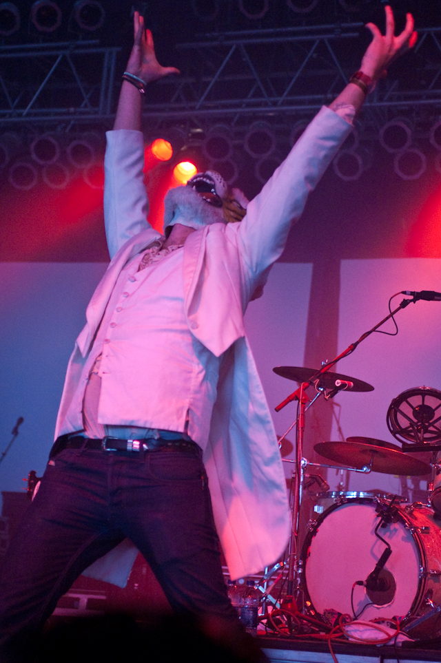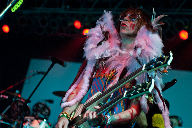 By now, the campy costumed shenanigans at of Montreal shows have been so thoroughly documented you'd think by now the charm would wear thin. But the Kevin Barnes team has created something akin to the Flaming Lips' audio-visual orgy with its own brand of sensory-overloading bacchanalia: only mildly tweaked each time out, and still totally delightful. This time tunes like "Nonpareil Of Favor," "Id Engager," "Rapture Rapes The Muses," "Heimdalsgate Like A Promethean Curse," and "A Sentence Of Sorts In Kongsvinger" soundtracked skits about, like, Christmas morning if all the presents emitted lethal gasses, just in case that's something you're keeping track of. This Tent was every bit as stuffy as it was for Bon Iver's set (if slightly less packed), giving KB another reason to strip (as if he needed it). Layers started coming off his torso as we set off to locate water (scarce among vendors) and peruse Centeroo's mostly fried food options. Haven't heard of any cameos from Kevin's hissing fauna, though.