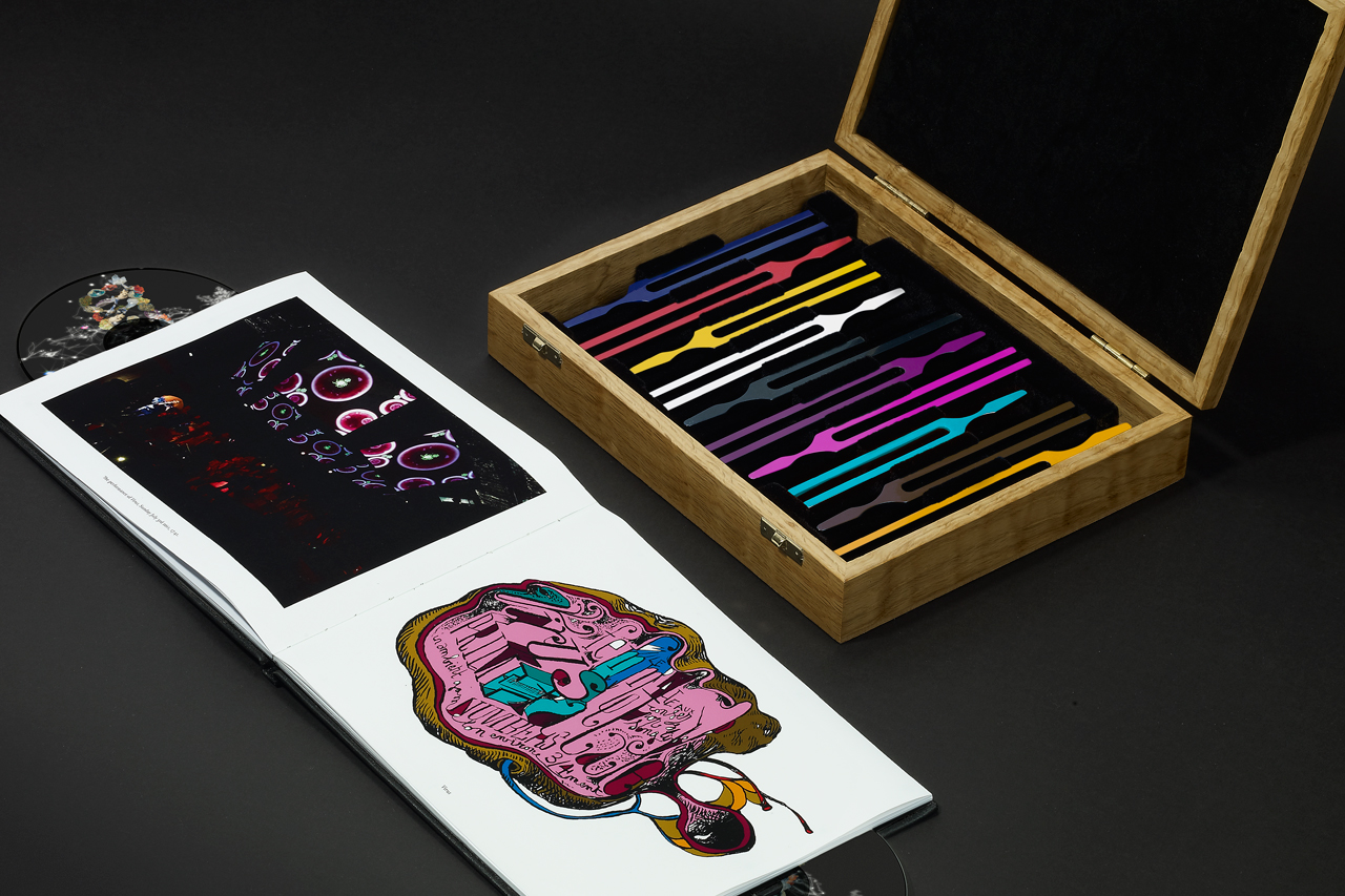 [This] strictly limited-edition, lacquered and silkscreened oak hinged lid case comes with the full Biophilia Manual as well as 10 chrome-plated tuning forks, silkscreened on one face in 10 different colors, stamped at the back, and presented in a flocked tray. Furthermore, each fork is adjusted to the tone of each of the tracks from Biophiia and covers a complete octave in a non-conventional scale. is adjusted to the tone of each of the tracks from Biophiia and covers a complete octave in a non-conventional scale.