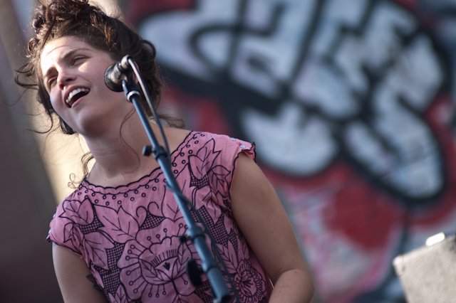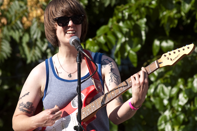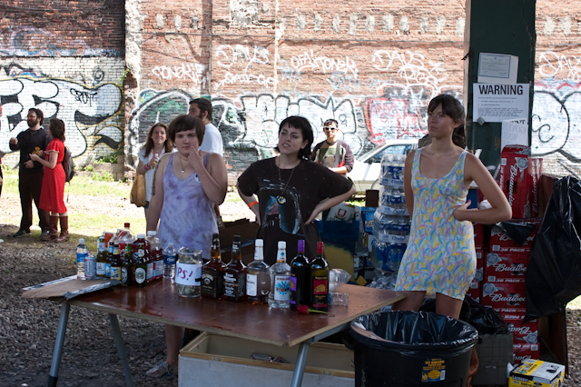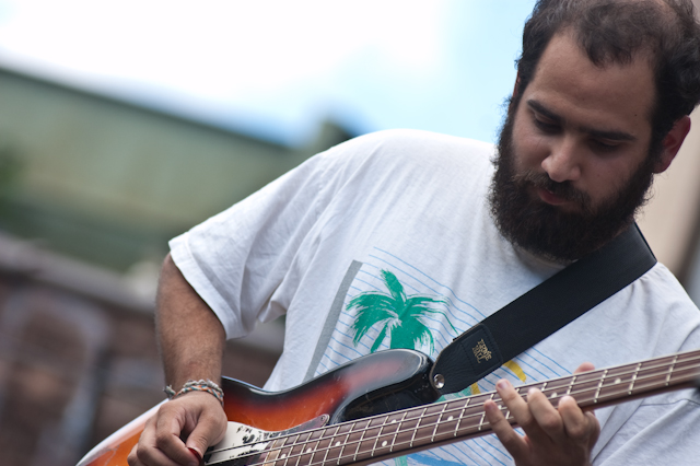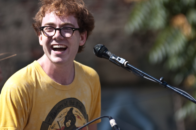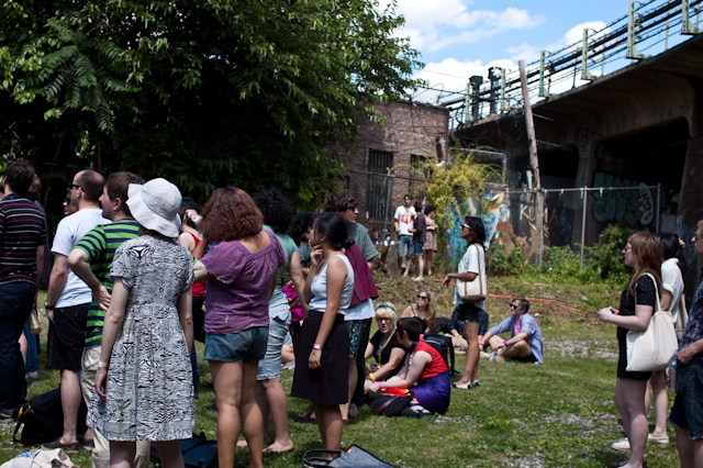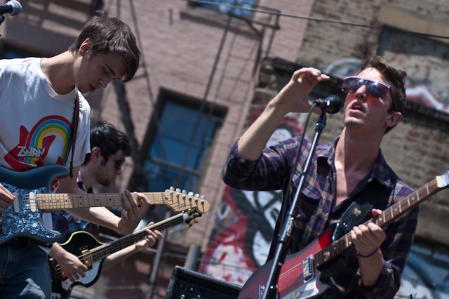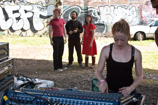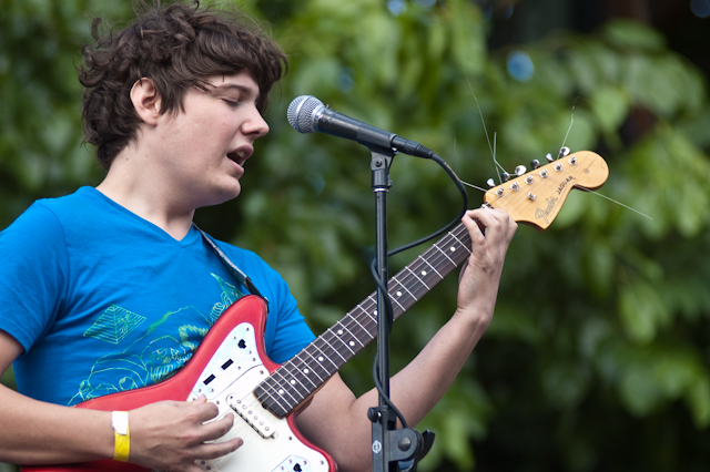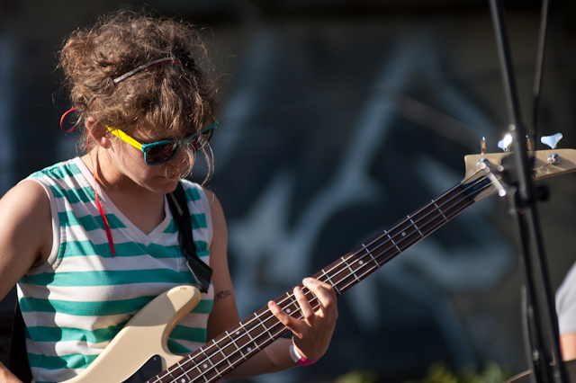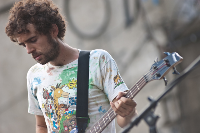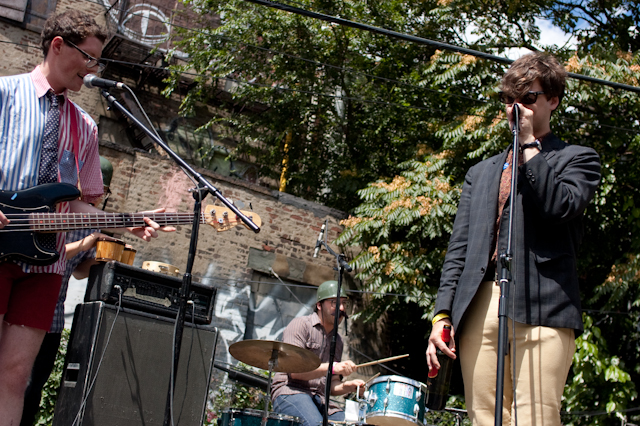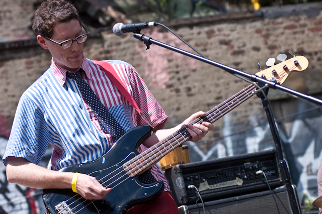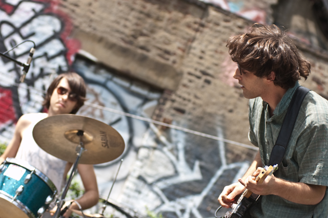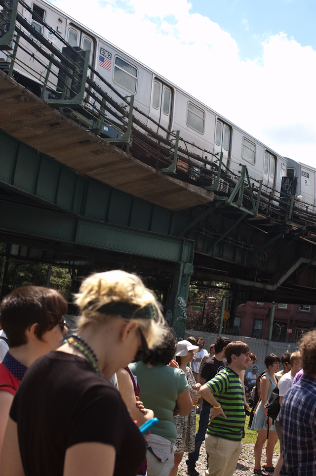 This past weekend was all about the USA, and nothing says America quite like a day full of shitgaze in a graffitied, degenerated yard under some train tracks in Bushwick (or "East Williamsburg," if your real estate agent is shady). The rosters of the Woodsist and Captured Tracks labels joined lo-fi forces with Todd P for a two-day outdoor festival this past Independents weekend, but since the threat of rain on Friday moved that day's action into the sweltering DIY space Market Hotel, our attendance was limited to Independence day proper. But even getting just one day's slate of bands hardly felt like settling, on a lineup that represented a sizable swath of a buzzy scene's buzziest artists.
