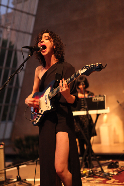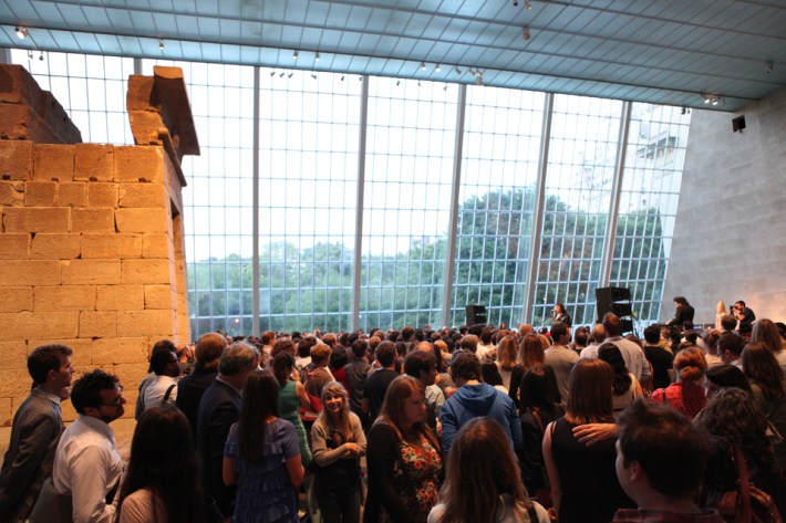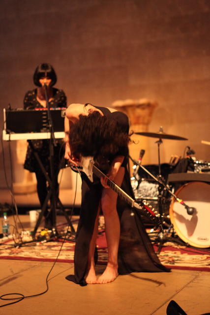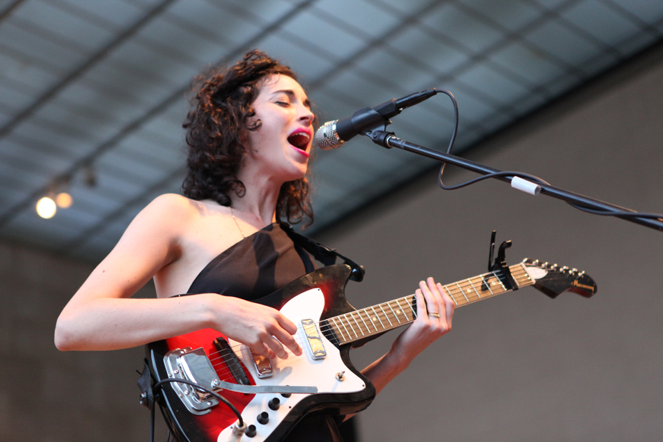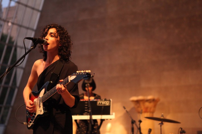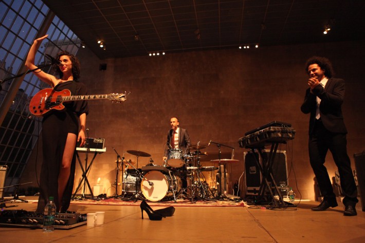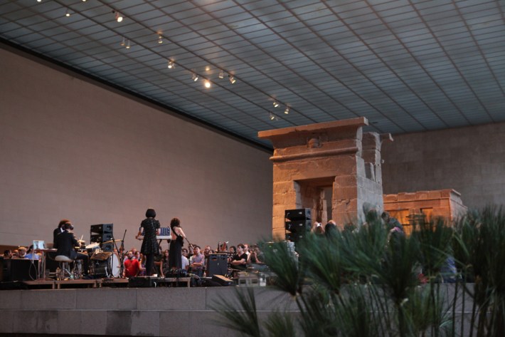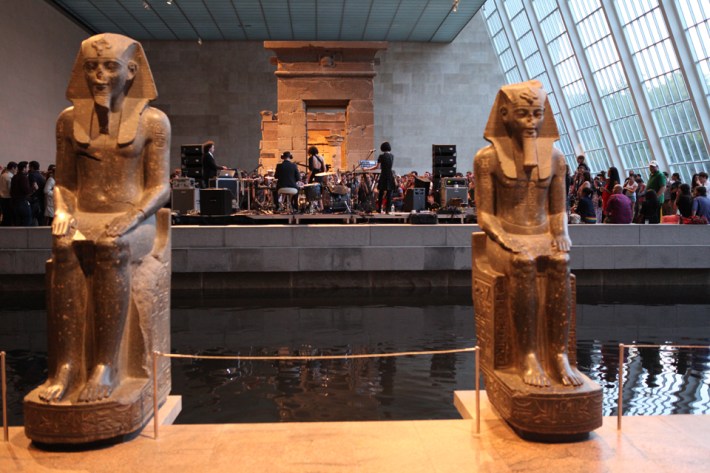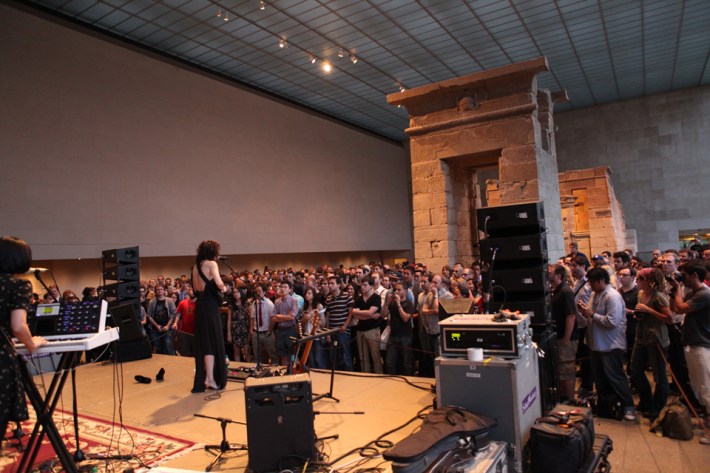 Ahhhh! So I just got home from seeing St. Vincent in the Temple of Dendur room at the Metropolitan Museum of Art in New York City, New York, and boy are my HEARTS tired! From loving it so much! Hahah. RIGHT? That was a great introduction to my burgeoning career as a music journalist. So, to get back into it right away with no segue other than this, the show was announced a few months ago and scheduled to happen on the roof of the Met, which sounded great, but due to warnings of a thunderstorm that never happened it was moved indoors. Booooo! Boo weather reports! But indoors was great, too. The Temple of Dendur was an amazing setting, where the events they have are generally for wealthy people donating money to something. A huge, beautiful space with a big slant-y glass window wall and an Egyptian temple with a pool around it, which is I believe how they describe it in ALL the brochures. "You really cannot go wrong," is a slogan that I will eventually sell to the Met for $2000 about how it doesn't matter if their concerts are indoors or on their roof.