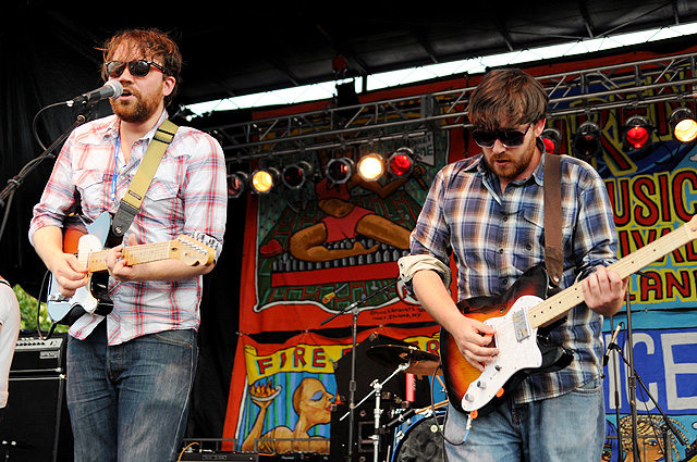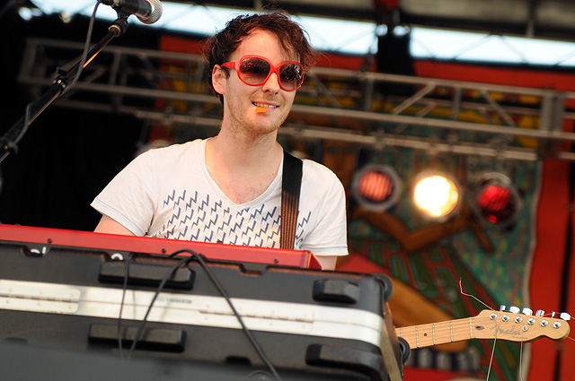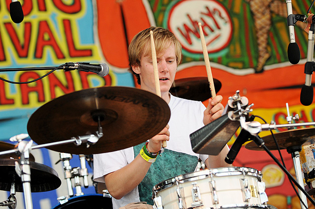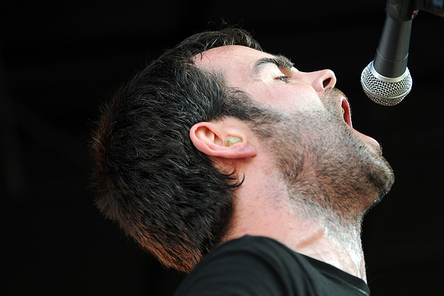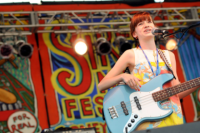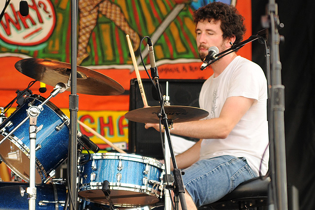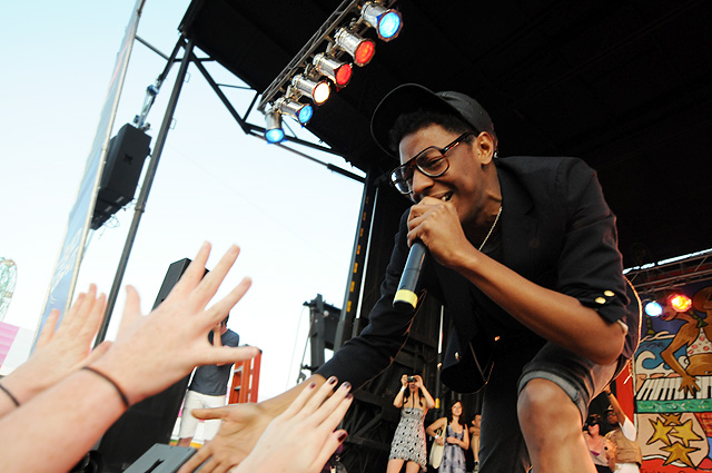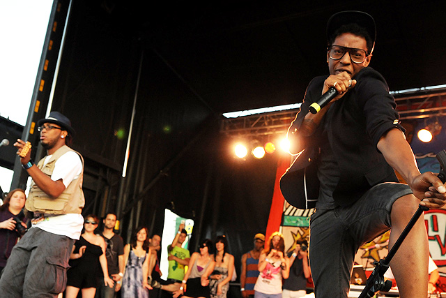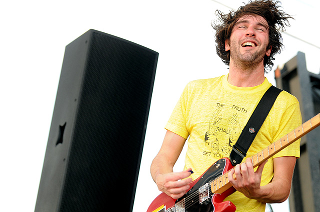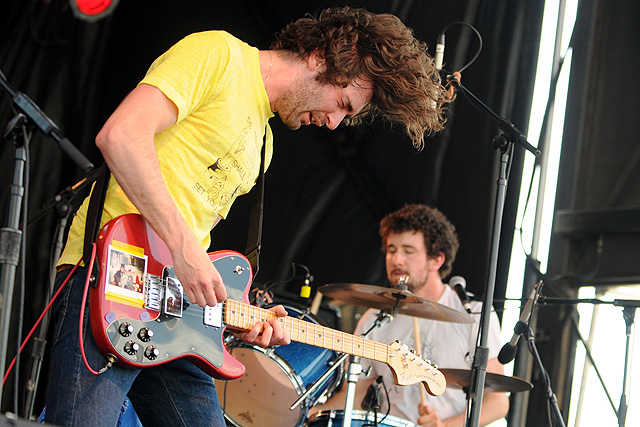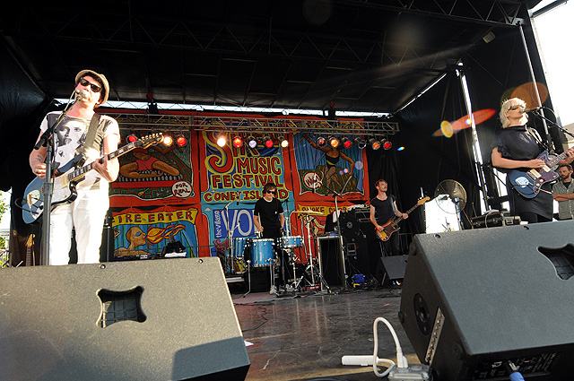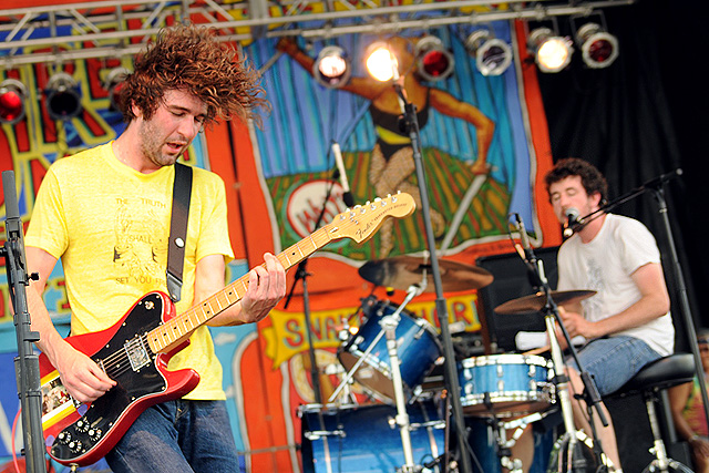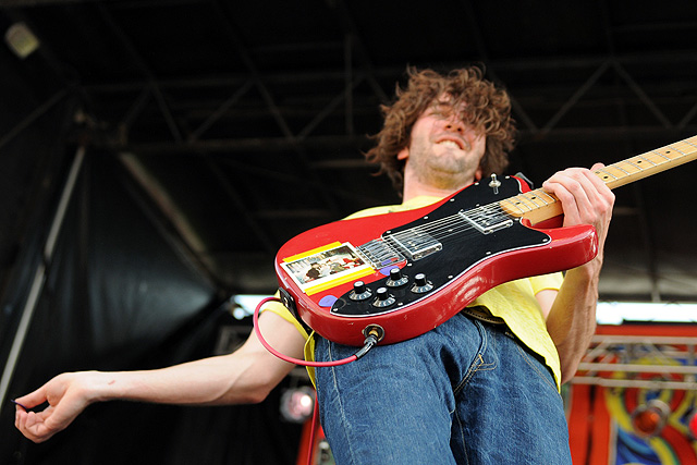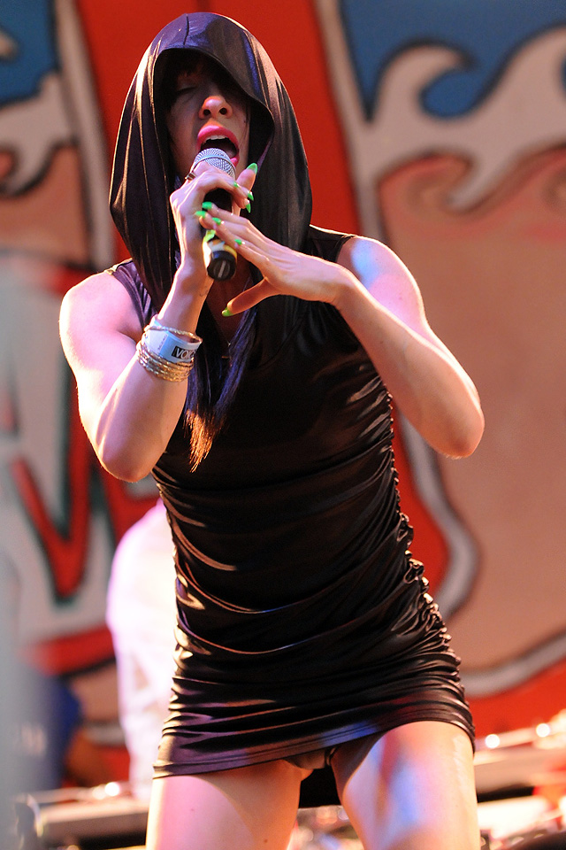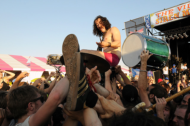 The Voice's annual indie rock fest gave audiophiles the second good reason to visit Coney Island last week, bringing out everyone from Spank Rock to Future Of The Left to Built To Spill on a sunny Saturday afternoon. We sent Natasha Ryan to eat all the hot dogs and take all the pictures, sadly missing the only NYC appearances from Japandroids and Micachu & The Shapes for at least a few months. Monotonix delivered a typically hairy and photogenic set, and Spank Rock delivered a (these days) typically brief one, reportedly doing like three songs before crashing over the stage barrier and laying still for 20 minutes as Ninjasonik and Amanda Blank picked up the slack. I wasn't there, but I did start reading tweets about a supposed guerrilla Spank Rock show at 12AM on the Williamsburg Bridge. So I walked there, and sure enough Naeem was hanging from metal rapping into megaphones and boomboxes while about 200 people drank, smoked, and danced in highly illegal fashion. Spank did four songs, I guess equaling his Siren output, before the thing just became a DJ party. No arrests (by the time I left at 1:30AM, at least). Some terribly shady pics of that madness here, here, and here, and some much better photos of the day at Siren in this photo gallery.