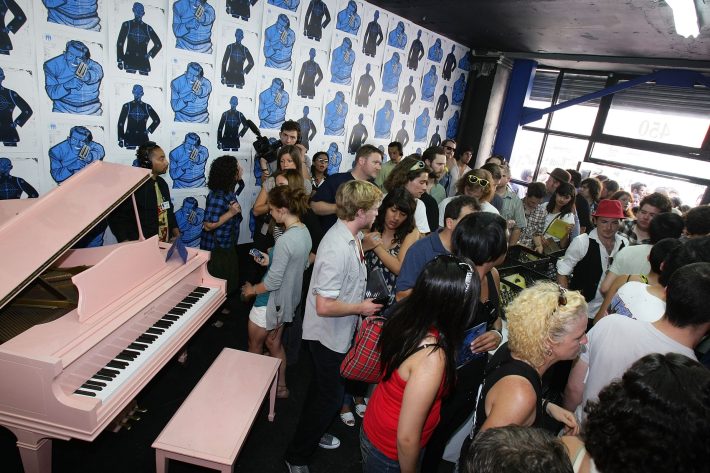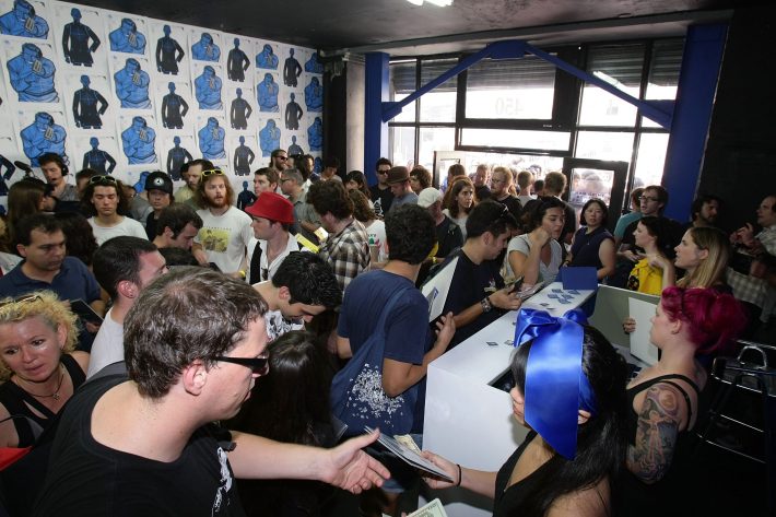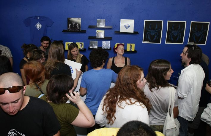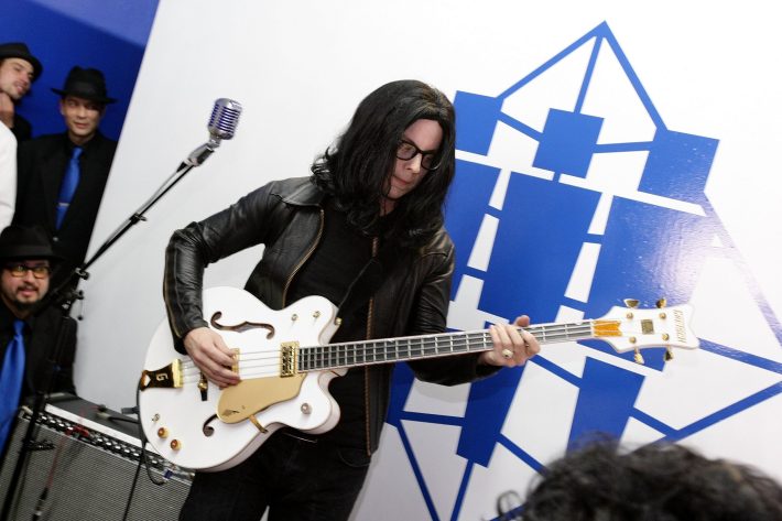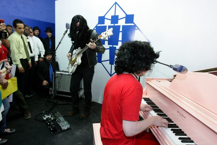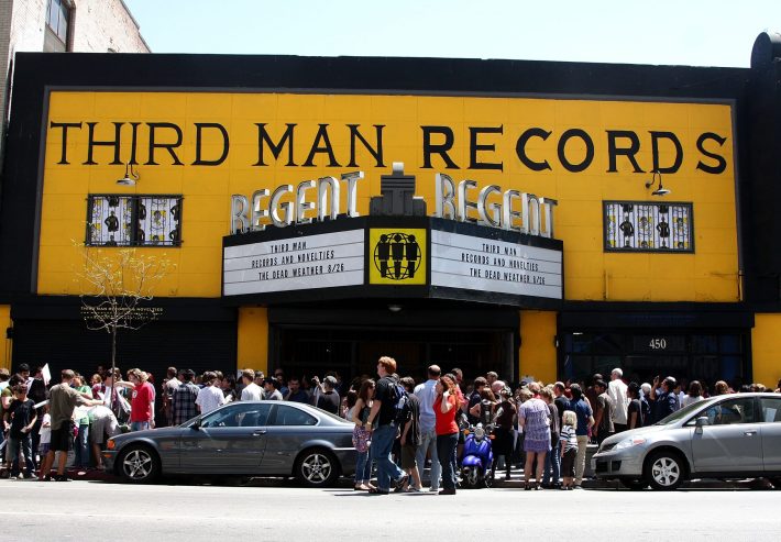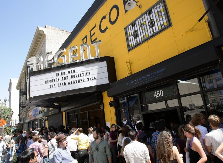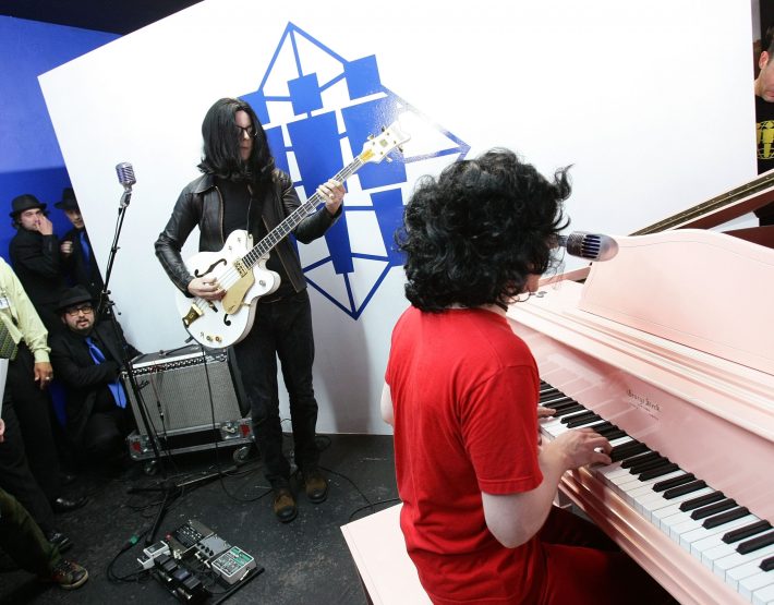 As record stores shutter across the country, Jack White's delightfully retro Third Man Records & Novelties is thriving. It's a simple strategy for retail success: keep the store open for only three days and host free performances by the Dead Weather. In July, Third Man set up a pop-up shop in NYC's LES; this week it's taking over the the Regent Theater in downtown LA. Wednesday was the grand opening, and tomorrow is the grand closing, so head over if you're in the market for some novelties. Yesterday afternoon found Jack White and Jack Lawrence briefly in costume as one another ("the Ol' Switcheroo" is the industry term I believe) before joining Alison and Dean for a set, all as lead-up to their Mayan Theatre gig in the evening. Speaking of Jack White costumes, you have a few days to win his outfit from the "Treat Me Like Your Mother" video. The Dead Weather play the Glasshouse in Pomona tonight at outside Jimmy Kimmel Live! Friday. Brendan Benson recently told Spin that the Raconteurs are on an indefinite break, so expect Jack White to announce a new band momentarily.