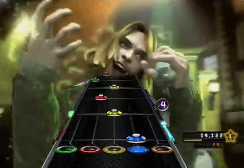 Not to mention Bush, Megadeth, and Public Enemy. Last week we reported that the Nirvana frontman has been licensed as a videogame character, complete with Daniel Johnston t-shirt. Frances Bean's rent isn't gonna pay itself, ya know? The game, Guitar Hero 5, was released yesterday and now we know that you can unlock Kurt in Career Mode and make him do wacky things like play guitar right-handed, scream yeah boyyy, and sing Gavin Rossdale lyrics. That last indignity is probably why the uploader of this highlight reel tagged it "spinning graves kurt cobain courtney love is fucking bitch"?