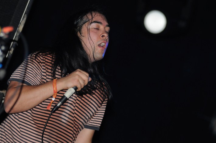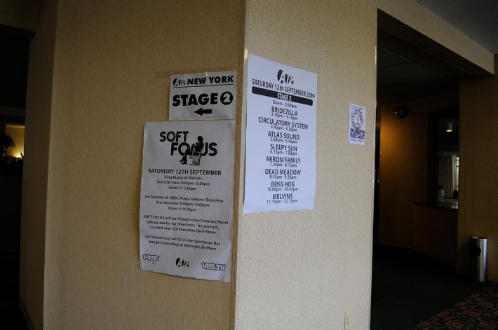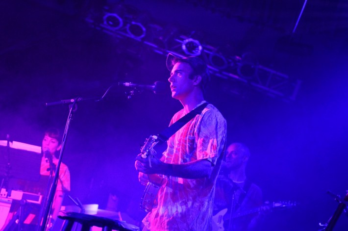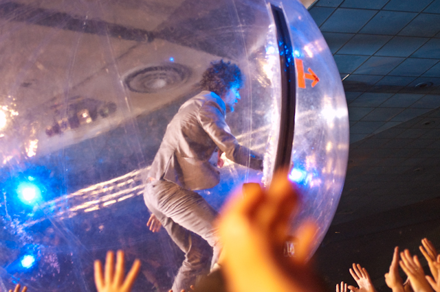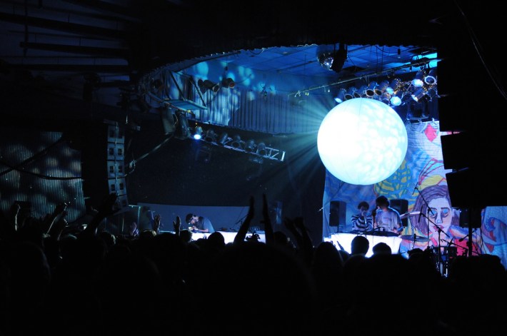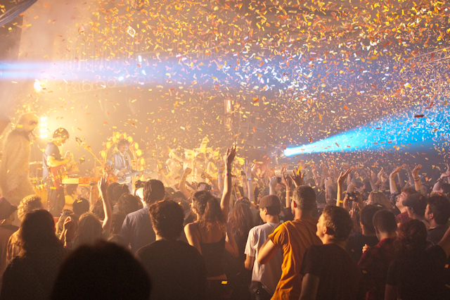 At this point people know what the Flaming Lips do, but they don't always do it in a small room that's painted to look like the underside of a spaceship, airbrushed walls making out stars and distant planets. Really, once they got in there and had their confetti guns, bouncing balloons, smoking megaphone, and lights in place, it was clear the Lips are the ideal Starlight Ballroom house band. (One new detail -- at least to us -- was an opening video projection where a nude dancing woman eventually sat down, spread her legs, and showed off a psychedelic vagina that grew in size, ultimately creating a space for the band to emerge through from backstage.) It was good vibes throughout the entire set:Coyne hugging fans, smiling at the stage divers, talking about how honored they were to curate ATP and to see so many bands (he was spotted throughout the weekend at various sets, at one point clearly stoked to be watching Boris), and how he wanted to sit on the stage after the show and sign autographs and take photos until everyone was ready to go home. It was that sort of communal sentiment that suddenly made it easy to imagine "Do You Realize" being performed at Woodstock. An area we're not that far from up here, really.