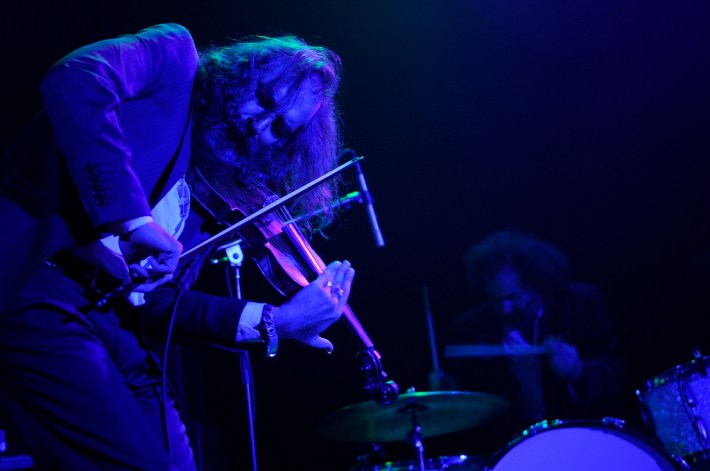 Dirty Three played one of the best sets of the weekend. While we were checking in, someone mentioned that Nick Cave was going to be singing with them, which seemed weird because the Australian trio replaces vocal lines with a violin: Cave was indeed on stage, but behind a white piano, contributing subtle lines to the band's 1998 album Ocean Songs. The real focus, though, was wiry, hirsute frontman Warren Ellis, who has the Robert Pollard kick down to a tee, and prefaced most songs with funny, winding tales, and un-miked howls into the Starlight Ballroom. On drums was Jim White, who's hard to stop watching and not just because of his Buzz Osborne hair. During their set Ellis joked that despite what some on-line sources said, they weren't responsible for emo. (Even though it was hard not getting at least a little verklempt during "Sea Above, Sky Below.") Instead, we found out, in Ellis's words, "Jim Morrison took my mojo."