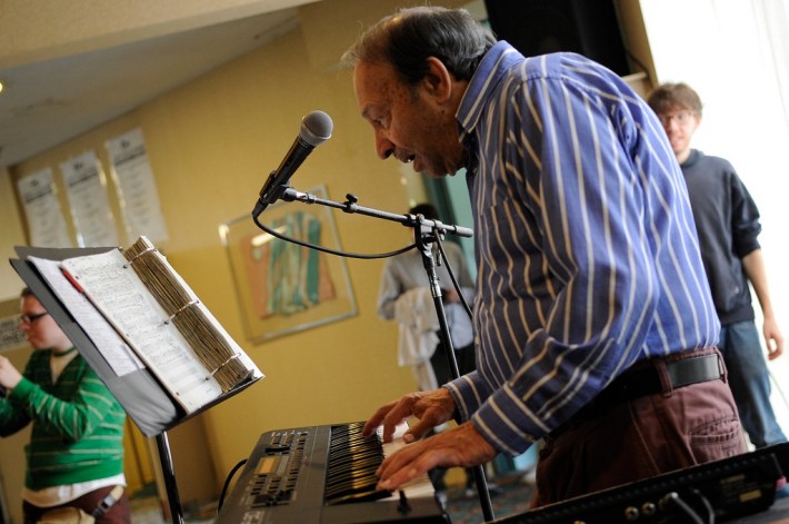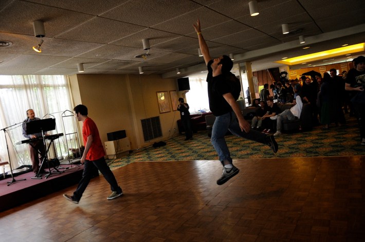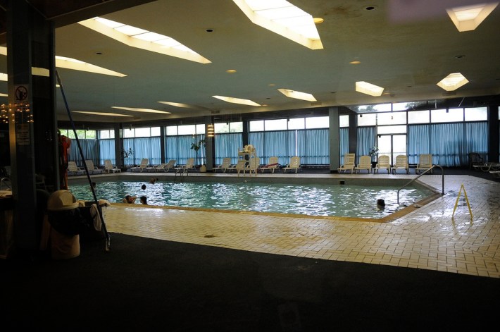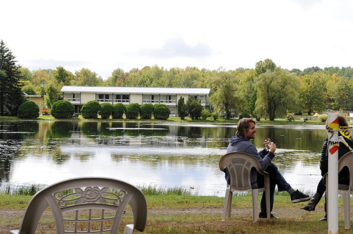 Our second year at Kutsher's was rainier than the first, but that didn't matter so much to us or, seemingly, the other attendees: If anything, this year felt more celebratory (and debauched) than 2008. You wouldn't be faulted for noting a certain hippie vibe. Visually, there were the tie-dyed shirts and hoodies (purchased at the amazing lost-in-time gift shop along with cat-shaped thermometers) sported by Sufjan and his band, Animal Collective, and soon enough sprinkled throughout the audiences. Or .... the perpetually smiling guy with the white bag who tried to sell us "special brownies" half a dozen times. Or the crusty, barefoot couple dancing like mad (and like hippies) during Animal Collective. Or folks making out on couches, doing weird things in the swimming pool, etc. Or the ad hoc dance floor that broke out in the lobby on Saturday night (while tellingly, downtown NYC icon Alan Vega, no hippie for sure, played pool by himself twenty feet away). Maybe part of the vibe was built-in by this year's co-curators the Flaming Lips. Wayne Coyne, in fact, may very well be the most positive vibing frontman you'll see all year: When the Lips closed the fest with "Somewhere Over The Rainbow" it felt not only fitting, but you almost sort of believed the sentiments for one non-cynical moment.