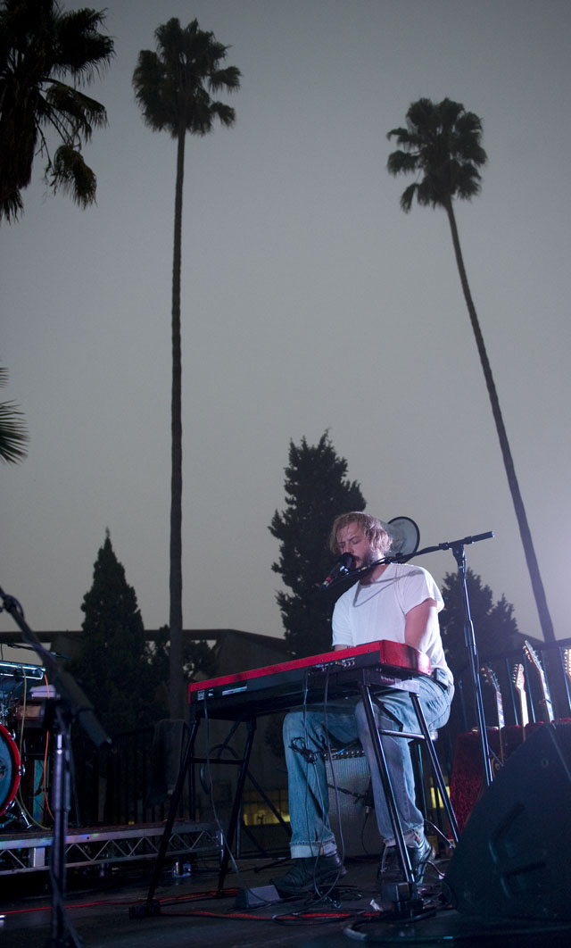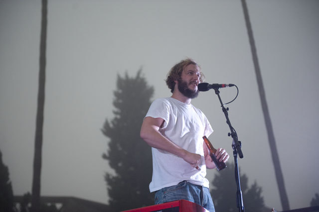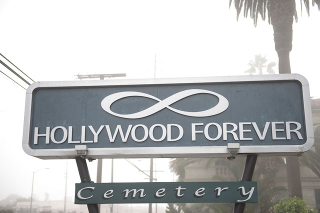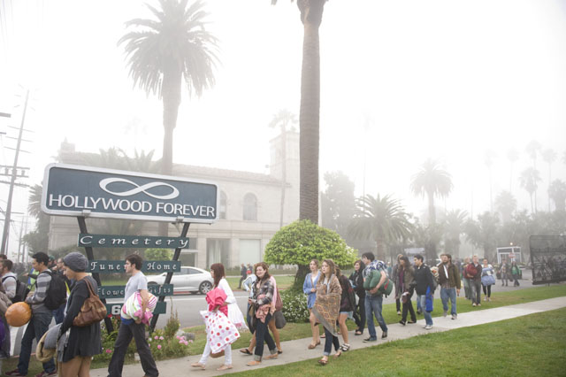 Fresh off of making waves by performing for the filmic undead, Justin Vernon continued his recent fascination with thespian mortality by holding his previously reported show at the Hollywood Cemetery, where all the actors are buried. Cemetery gates opened at the stroke of midnight (obviously). Coffee and donuts were served. Photographer Andrew Youssef arrived shortly after 2AM, joining roughly 2,000 people for the event which kicked off with a screening of Wes Anderson's Bottle Rocket before Buddhist monks performed a ritual blessing to cleanse the air for Bon Iver's 6AM set. The Wisconsinite harmonized into the dawn with a set that covered pretty much "all the songs they known," which for a man with just an LP and EP to his stage name isn't that many songs, but certainly enough to cement some goosepimply cemetery memories. (There was a feel-good reunion, too, Justin welcoming his old DeYarmond Edison bandmates in Megafaun out for a tune.) Watch as the sky grows lighter during this "Babys":
