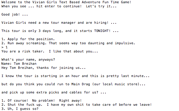 Vivian Girls' Katy Goodman is learning to code in Ruby and, for the sake of the exercise or probably just for fun, she made a text-based Choose Your Own Adventure game. Instructions: