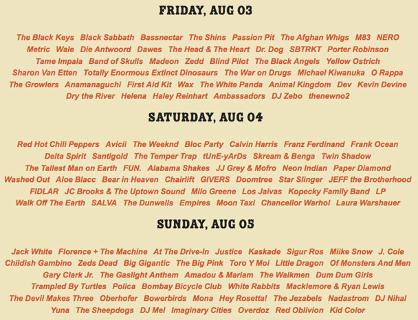 Red Hot Chili Peppers, The Black Keys, Black Sabbath, Jack White, Florence + the Machine, At the Drive-In, Avicii, The Shins, Justice, Passion Pit, Sigur Ros, The Weeknd, M83, Miike Snow, The Afghan Whigs, Bloc Party, Franz Ferdinand, Frank Ocean, J. Cole, Childish Gambino, Delta Spirit, Metric, The Temper Trap, Wale, Die Antwoord, Dawes, tUnEyArDs, The Head & the Heart, The Big Pink, Twin Shadow, The Tallest Man on Earth, Toro y Moi, Dr. Dog, Of Monsters and Men, Gary Clark Jr., Alabama Shakes, The Gaslight Anthem, Amadou & Mariam, Band of Skulls, SBTRKT, Tame Impala, The Walkmen, JJ Grey & Mofro, fun., Neon Indian, Dum Dum Girls, Washed Out, Aloe Blacc, Trampled by Turtles, Bear in Heaven, Blind Pilot, Chairlift, The Black Angels, Yellow Ostrich, Givers, Polica, Bombay Bicycle Club, Sharon Van Etten, White Rabbits, Doomtree, Macklemore & Ryan Lewis, The Devil Makes Three, Oberhofer, The War on Drugs, Michael Kiwanuka, O Rappa, Bowerbirds, Orchard Lounge, Mona, The Growlers, Hey Rosetta!, JEFF the Brotherhood, Anamanaguchi, First Aid Kit, Wax, FIDLAR, JC Brooks & the Uptown Sound, Milo Greene, Los Jaivas, Kopecky Family Band, The Jezabels, LP, Yuna, Walk Off the Earth, Animal Kingdom, Dev, The Sheepdogs, The Dunwells, DJ Mel, Empires, Kevin Devine, Dry the River, Helena, Haley Reinhart, Imaginary Cities, Overdoz, Ambassadors, DJ Zebo, Chancellor Warhol, Laura Warshauer, Red Oblivion